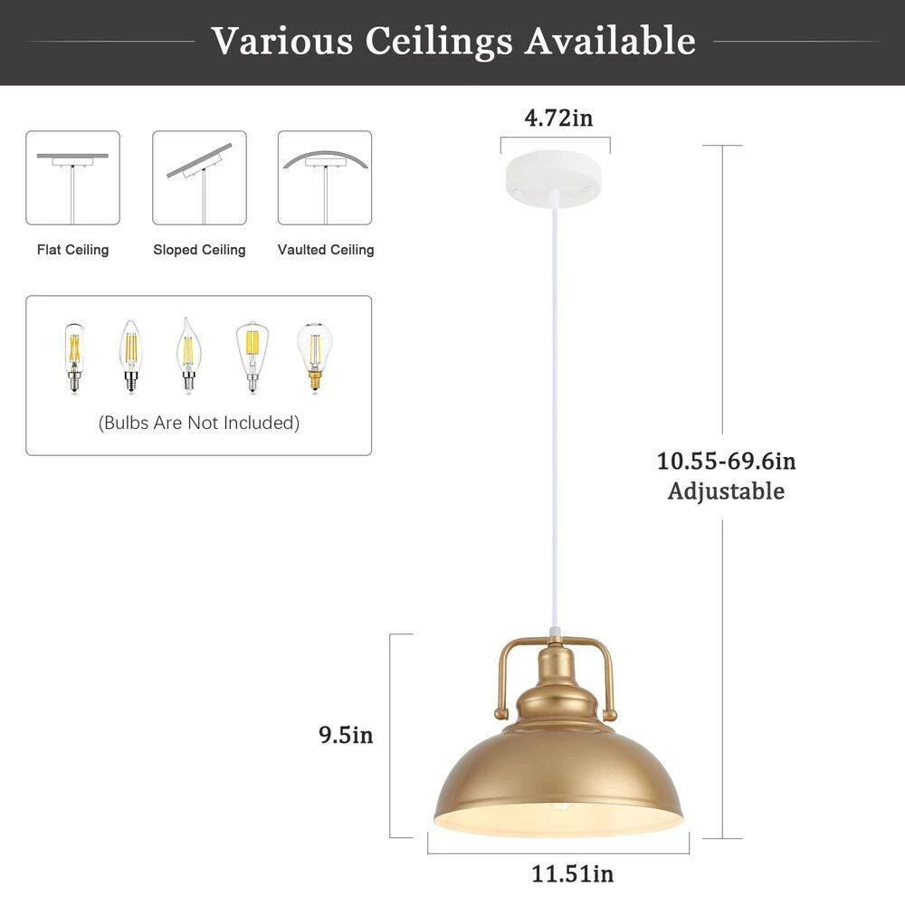 Introducing you to this minimalist 1-light dome pendant light. Featuring high quality metal materials and a painted finish to make the fixture more sturdy. The dimmable light feature allows you to create the perfect ambiance. Compatible with sloping ceilings, the chandelier hangs from the ceiling and radiates a warm glow, illuminating elegant and charming spaces and creating a serene and cozy atmosphere. This chandelier effortlessly combines rustic elegance with contemporary style, making it ideal for enhancing any space.