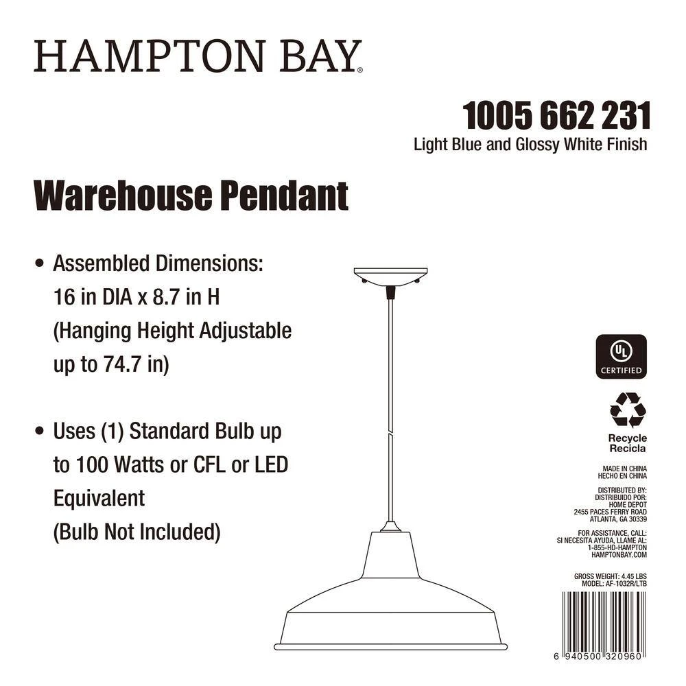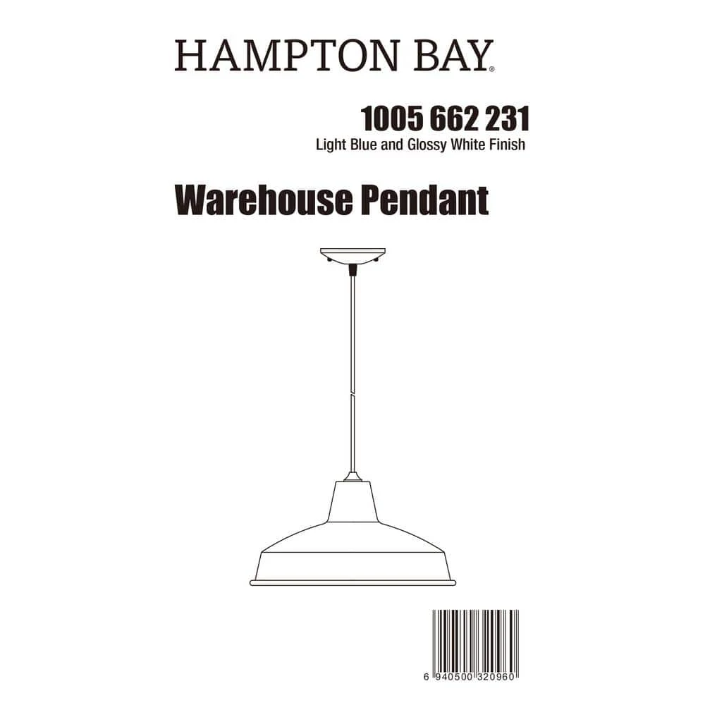 Bring new light into your home with this Hampton Bay 1-Light Light Blue Warehouse Pendant with Metal Shade. The adjustable hanging length makes for an easy installation. This light blue pendant is a great choice for your living room, garage, den or more.