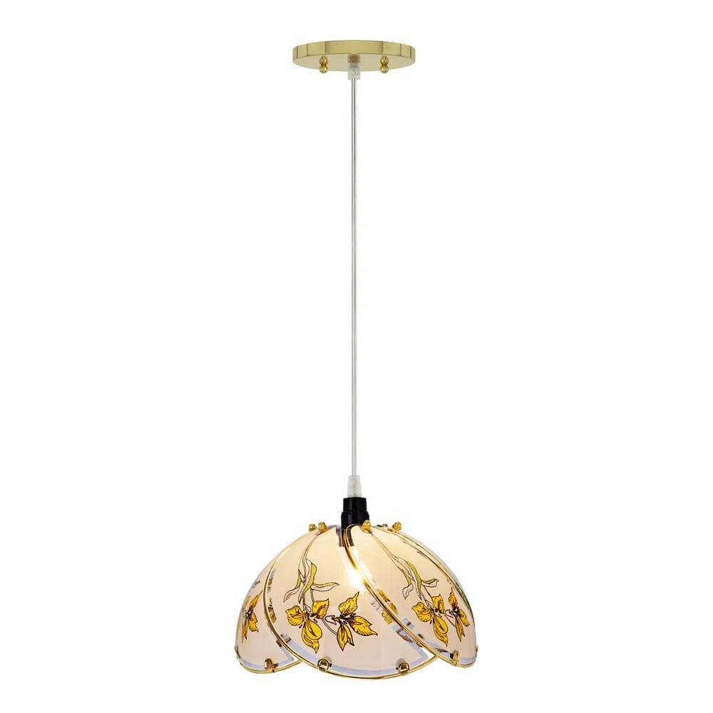 Aspen Creative is dedicated to offering a wide assortment of attractive and well-priced portable lamps, kitchen pendants, vanity wall fixtures, outdoor lighting fixtures, lamp shades and lamp accessories. We have in-house designers that follow current trends and develop cool new products to meet those trends. Aspen Creative offers a 1 light hanging pendant ceiling light, with a transitional design in polished brass. It has a floral pattern glass shade. Fixture provided with 60 in. of field-cuttable cloth cord. Fixture Dimensions: 8-3/4 in. width x 67-1/2 in. height. Uses 1, E12 candelabra base light bulb, 60-Watt max, bulb not included. It is UL Listed for indoor, dry location. Suitable for dining room, bedroom and living room, kitchen island and restaurant bar applications.