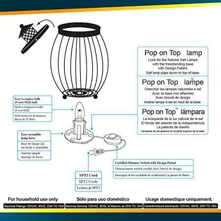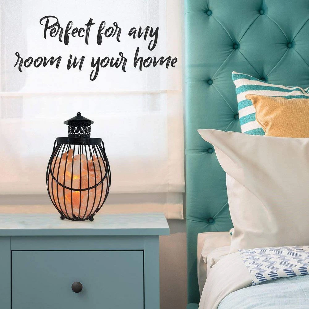 Brighten your room with the WBM Himalayan Glow natural crystal Salt lamp. The warm amber light from this lamp complements any space, while also activating the salt crystal to purify the air. A unique salt lamp is made from natural Himalayan salt crystals hand mined in the Himalayan mountains. The lantern basket lamp is made of intertwined metal and features a black polished coated finish heating the Salt with the included bulb releases negative ions into the air, creating an effect similar to an ionizer, purifying the surrounding air Once lit the lamp will emit a calming amber color lamp and cord assembly are UL approved. Includes 6 ft. Power cord, 25-Watt light bulb, rotary dimmer switch for full light control.