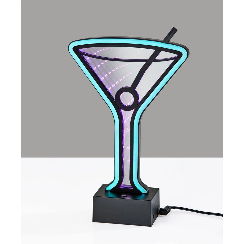 It’s never too early for a drink with this bold Simplee Adesso Infinity Neon Martini Glass light that brings a retro feel with a modern twist to any space. Its black, rectangular plastic base houses 3 AA batteries (not included), making it easy to add a fun and stylish glow to any table, desk or shelf without the mess of a cord. You can alternatively power the light with the included 8 ft. USB cable for unlimited use without needing to worry about replacing batteries. for added versatility, the light comes with mount holes located on the back of the base for mounting to a wall, creating contemporary wall art. Made of mirrored plastic with a neon border, this 10 in. H and 6.25 in. W piece includes a 1-Watt LED light operated by a 4-way push summary switch, letting you alternate between a solid neon blue border light only, infinity psychedelic purple all-over light only or both lights. Even with the light powered off, the stylish martini glass detail creates an eye-catching vintage look and can function as a mirror.