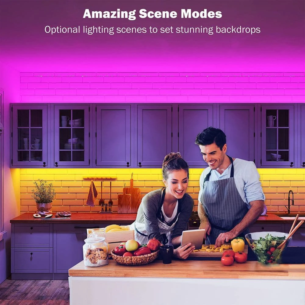 100FT RGB LED strips with music sync and app control! Create a visual feast with 16 million colors and 64 scene modes. Use the timer as a light alarm clock or stick to any dry surface. Not waterproof-best for bedrooms/ceilings.