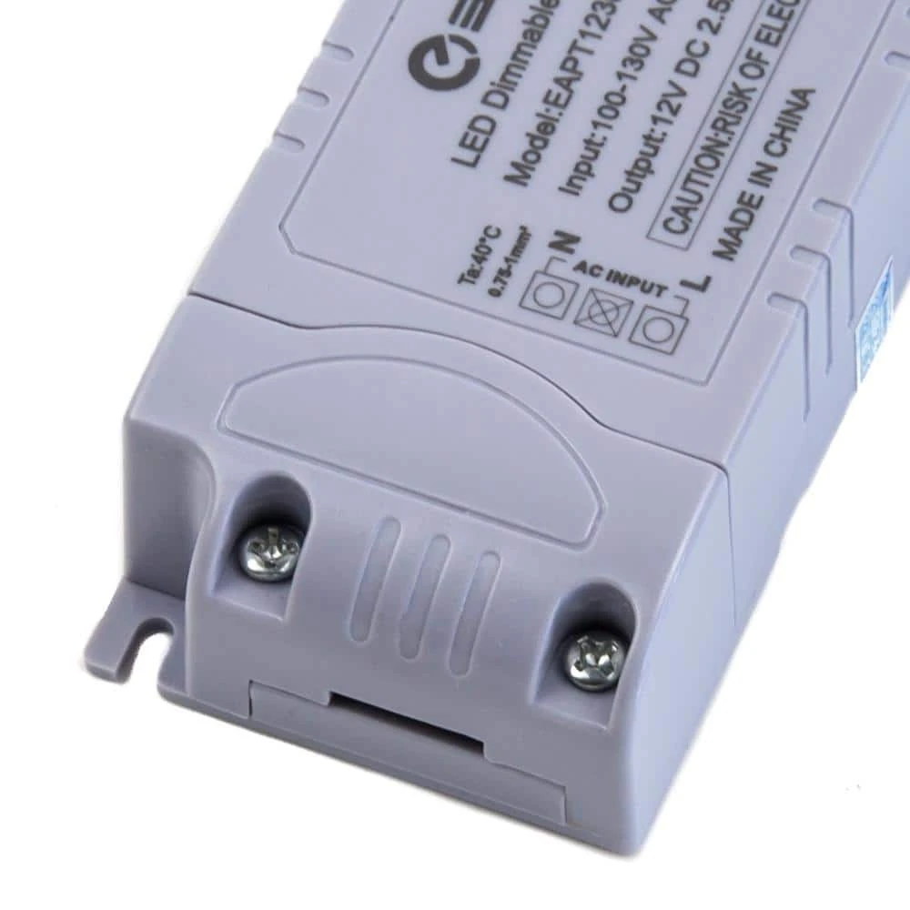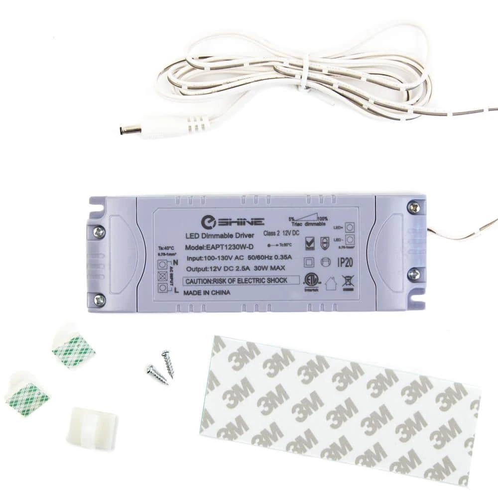ESHINE hardwire 12-Volt DC Kit LED power supply drive is a reliable power source for LED strips and any other devices with power less than 30-Watt and running voltage at 12-Volt (DC). It is compatible with our 12-Volt ESHINE lighting. IMPORTANT: Will NOT work with our 24-Volt Lighting. Input-Voltage: 100-Volt – 130-Volt AC 50/60 Hz Output-Voltage: 12-Volt DC, Output Current, Full Load: 2.5 Amp Output Power: 30-Watt Certification: CE, UL, CB, FCC, ROHS Operating Temperatures: minus 40° – plus 55° For use INDOOR ONLY. Dimensions (LxWxH): 3.7 in. x 1.8 in. x 0.9 in., Preinstalled cable length: 4.9 ft. Dimmable transformer and compatible with wall dimmers. Here is a list of-Wattage consumed by ESHINE lighting bars: 7 in. bar – 2-Watt plus/-10%, 12 in. bar – 3-Watt plus/-10%, 20 in. bar – 5-Watt plus/-10%, 40 in. bar – 10-Watt plus/-10%, This power transformer can handle MAX 24-Watt load. Do not overload it.