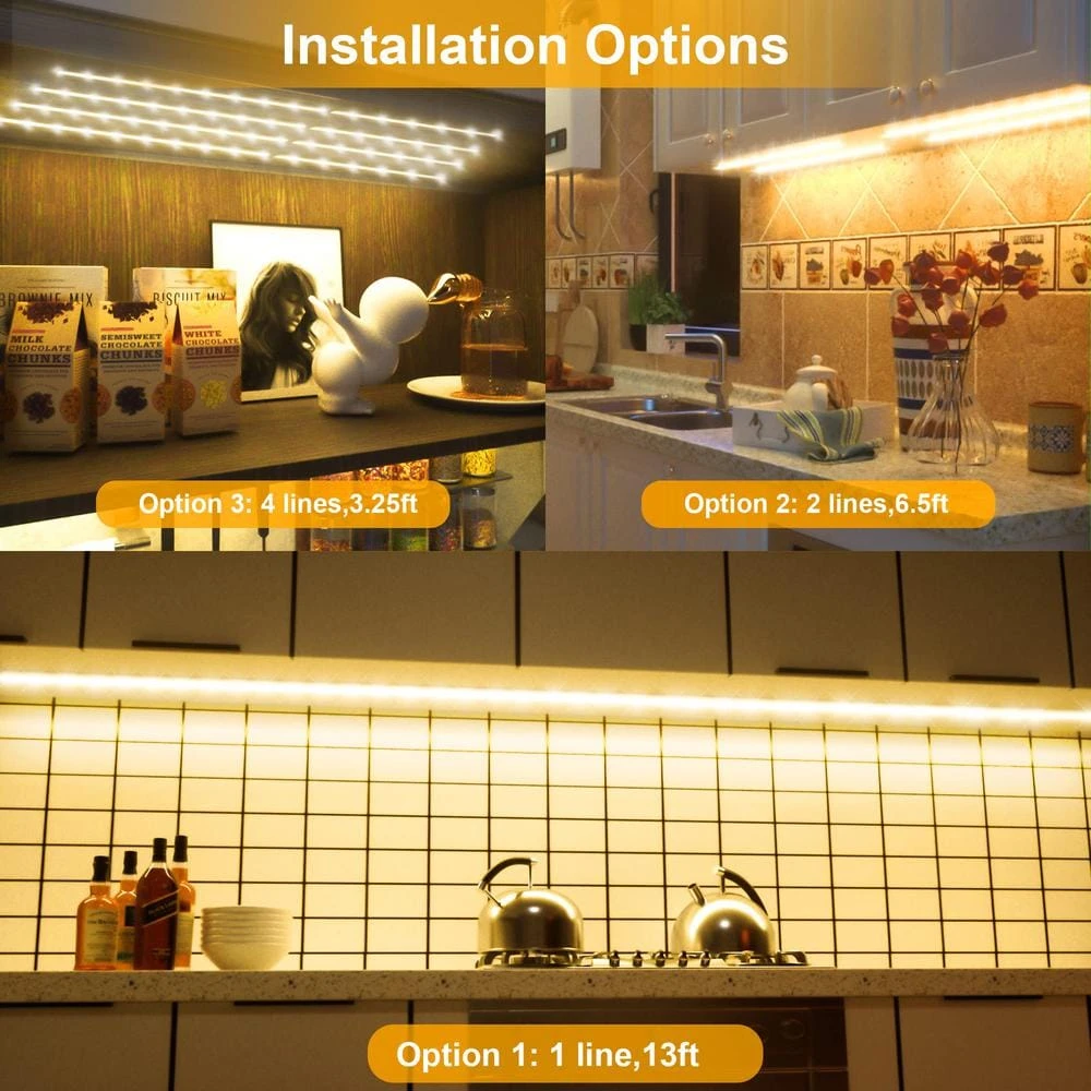 Eight 20 in. high brightness strips with 4-flexible 5.9 in. and 4-compact 2.8 in. connectors. These connectors are designed for corner bending and folding for free combination. Immersed in the warm embrace of 2700k white light, whether it is super bright mode or delicate 6-level brightness adjustment, just one click, remote control or mini dimmer in hand, you can control the light as you like. Dual control mode, make your life more convenient: wireless remote control set on/off, 6 levels of brightness control, 2-light scene mode and 5 intelligent timing off function in one, The mini dimmer is simple and efficient, enabling instant switching and brightness adjustment to meet your every minute need for light and shadow. Built-in timer function, whether it is 30 minutes of short reading time, or up to 4 hours of warm companionship, can be accurately set, automatic lights out, energy saving and worry. The memory function ensures that each time it is turned on, the brightness set last time is maintained, creating a familiar and comfortable environment. Powerful self-adhesive design makes installation easier and faster than ever before. Whether it is under the kitchen cabinets, deep in the closet, on the living room shelves, or even in every corner of the home, simply clean the surface and paste it easily. No need for professional installation, create a dedicated lighting space in minutes.