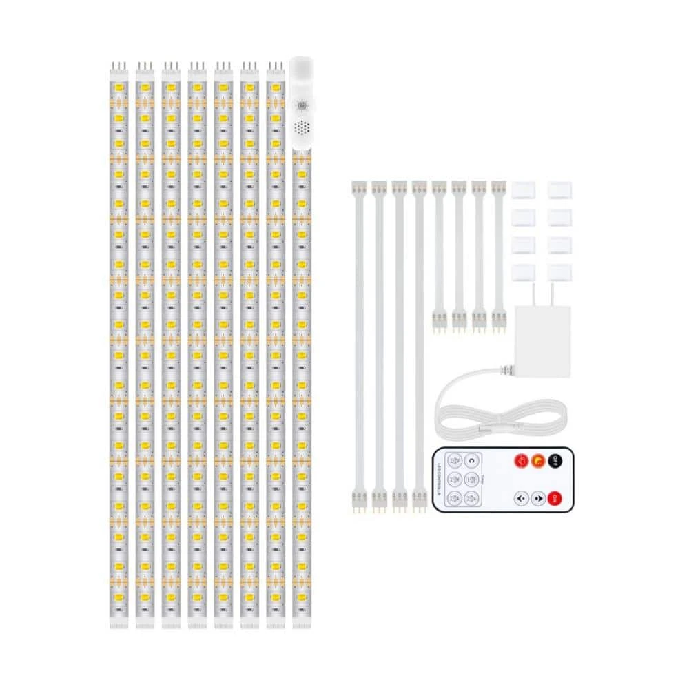 8, 20 in. LED strips, combined with four flexible 5.9 in. connectors and four compact 2.8 in. connectors, can be easily handled in straight lines or corner turns to perfectly fit your home layout and show personalized lighting style. Using 4000k neutral white light, super brightness, with 6 exquisite adjustment, whether it is the first soft in the morning or the warm company at night, it can be easily achieved through the remote control or mini dimmer, and adjust to the most comfortable brightness. Dual control mode, make the operation more convenient. In particular, intelligent timer and memory function are added. Preset 30 minutes, 1/2/3/4 hours automatic light off option, so that the light quietly on when you need, and silently exit when you do not need, life is more orderly. The memory function ensures that the lights are restored to your personalized Settings every time you turn them on, and every time you light them up, it’s a familiar and warm encounter. Strong self-adhesive design makes installation easier and faster than ever before. Whether it is the cooking time in the kitchen, the search in the depths of the cupboard, the quiet storage in the closet, or the atmosphere created behind the TV wall in the living room, even the most obscure corner, can be revitalized by this light. In just a few simple steps, you can enjoy this lighting art created by yourself for a long time.