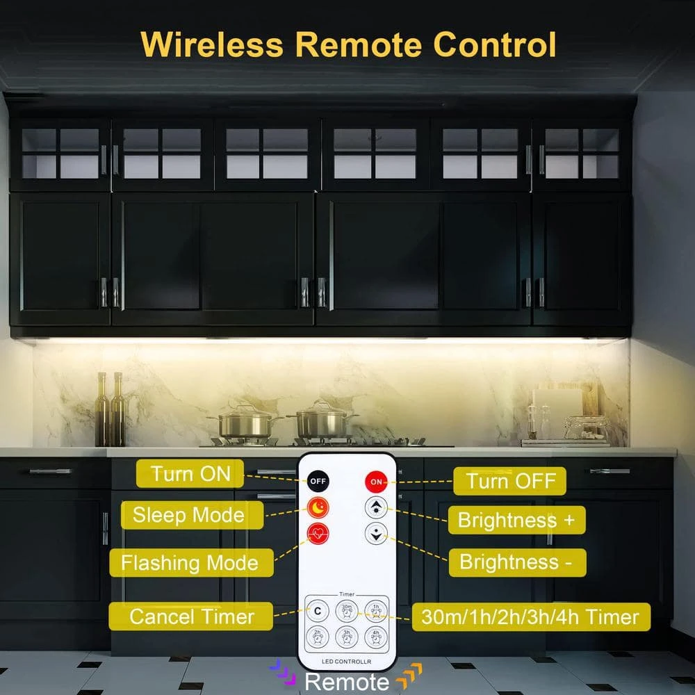 - Dual control: cabinet lights can be controlled via wireless remote control and mini dimmer, the remote control features on/off, 6 levels of brightness, 2 lighting modes and 5 timed off options, and the mini dimmer controls on/off and brightness