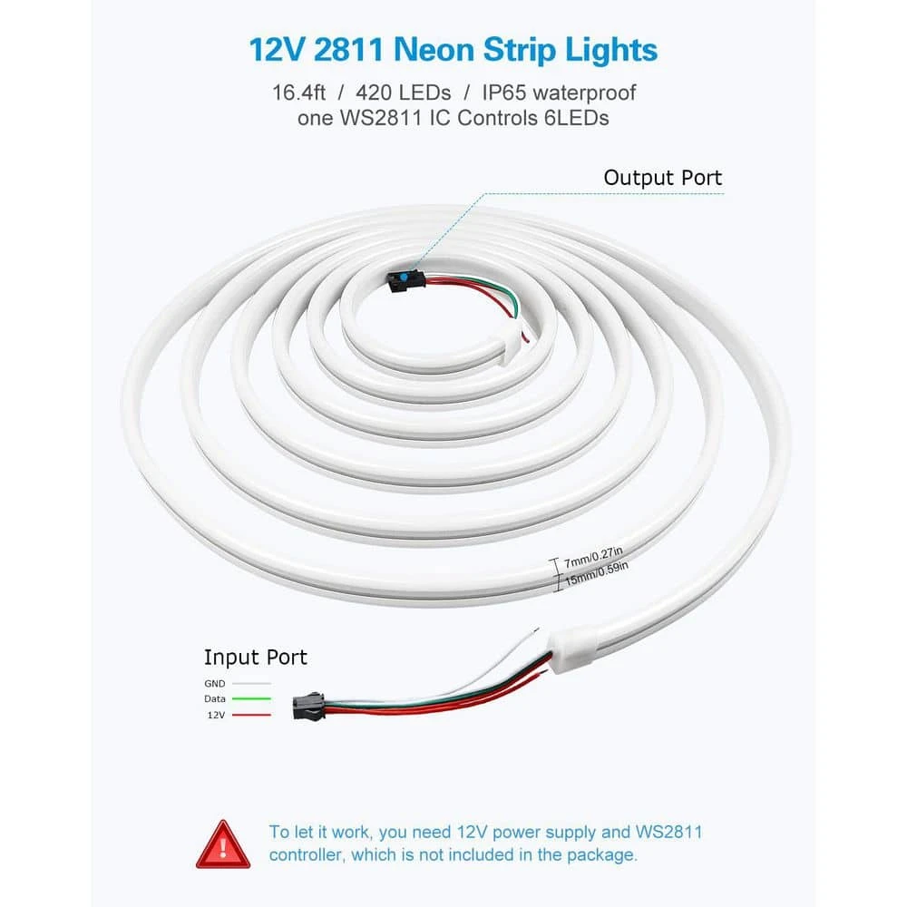 Designed for versatile indoor/outdoor use, this 10M (32.8ft) strip combines neon-like aesthetics with advanced LED technology, featuring 960 LEDs and 160 individually addressable WS2811 ICs (6 LEDs per IC) for precise dynamic effects like rainbow, chasing, and breathing patterns. Its thick, flexible silicone sleeve mimics traditional neon without transformers or gases, bending up to 90° for seamless installations. Compatible with Arduino, Raspberry Pi, and smart controllers (SP105E/SP601E/SP611E for apps, SP107E for music sync, SP108E for WiFi), it supports DIY automation and voice control. IP65 waterproofing ensures durability in wet environments, while user-friendly 3-pin JST-SM connectors and power injection points simplify setup. Ideal for bedrooms, gaming rooms, TVs, pools, and holiday decor, it requires a 24V 5A 120W power supply (ASIN: B01GC6VS8I) to prevent overheating. Critical notes: Use the female input connector for correct signal flow and avoid underpowered adapters. Perfect for creating customizable, vibrant lighting in any space.