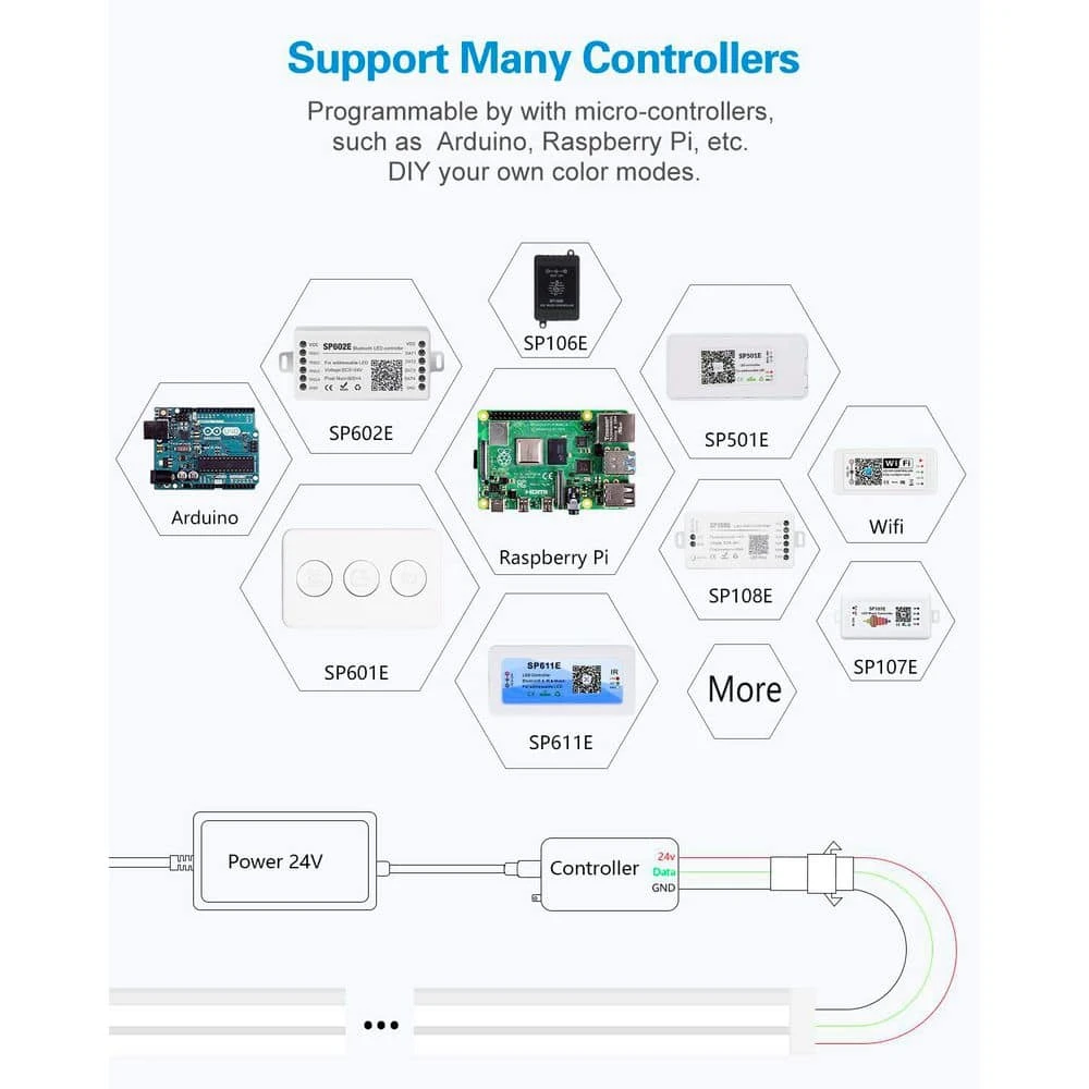 - Versatile controller compatibility: programmable options: works with arduino, raspberry pi, t1000s, and k1000c for diy automation and custom scripting, smart app control: supports sp105e/sp601e/sp611e apps for wireless adjustments, sp107e music-sync modes, and sp108e wifi connectivity for voice control (e.g., alexa, google home), note: controller and power supply sold separately