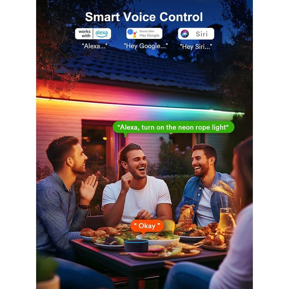 Designed for creativity and durability, this Neon Rope Light features a soft, high-grade silicone construction offering 20% more flexibility than traditional neon strips, ideal for DIY projects. Its anti-yellowing and translucent properties ensure vibrant, long-lasting effects. Boasting 60 LEDs per meter, it delivers uniform, ultra-bright illumination with no dark spots, perfect for gardens, yards, or events. Advanced RGB technology enables over 16 million color options and customizable scene modes to match any ambiance. Certified IP65 waterproof, both the lights and control box withstand rain, snow, and heat for year-round use. Smart controls include voice activation via Alexa/Google Assistant, app management, and a remote, allowing timers, DIY modes, and music synchronization for dynamic, rhythm-based lighting. Easy installation is ensured with 15 wall clips/screws and 15 ground stakes. Enhance parties, holidays, or daily decor with this versatile, weatherproof lighting solution-compatible with 2.4G WiFi only.