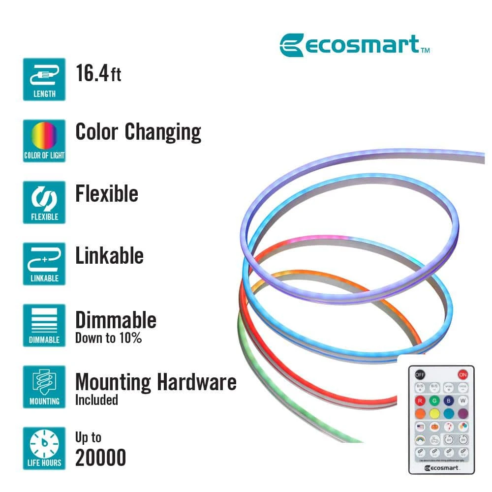 The EcoSmart 16.4 ft. RGBWIC LED Strip Light can be used to brighten up any space. The lights are wet rated so can be used both inside and out. Great for outdoor patios, pool areas, living rooms, bedrooms and office spaces. It includes 11 dynamic modes like chasing, tracing, stacking, etc. The product is linkable up to 65.6 ft. With mounting screws and clips, you can easily fix them up at your desired place. Just have a try!