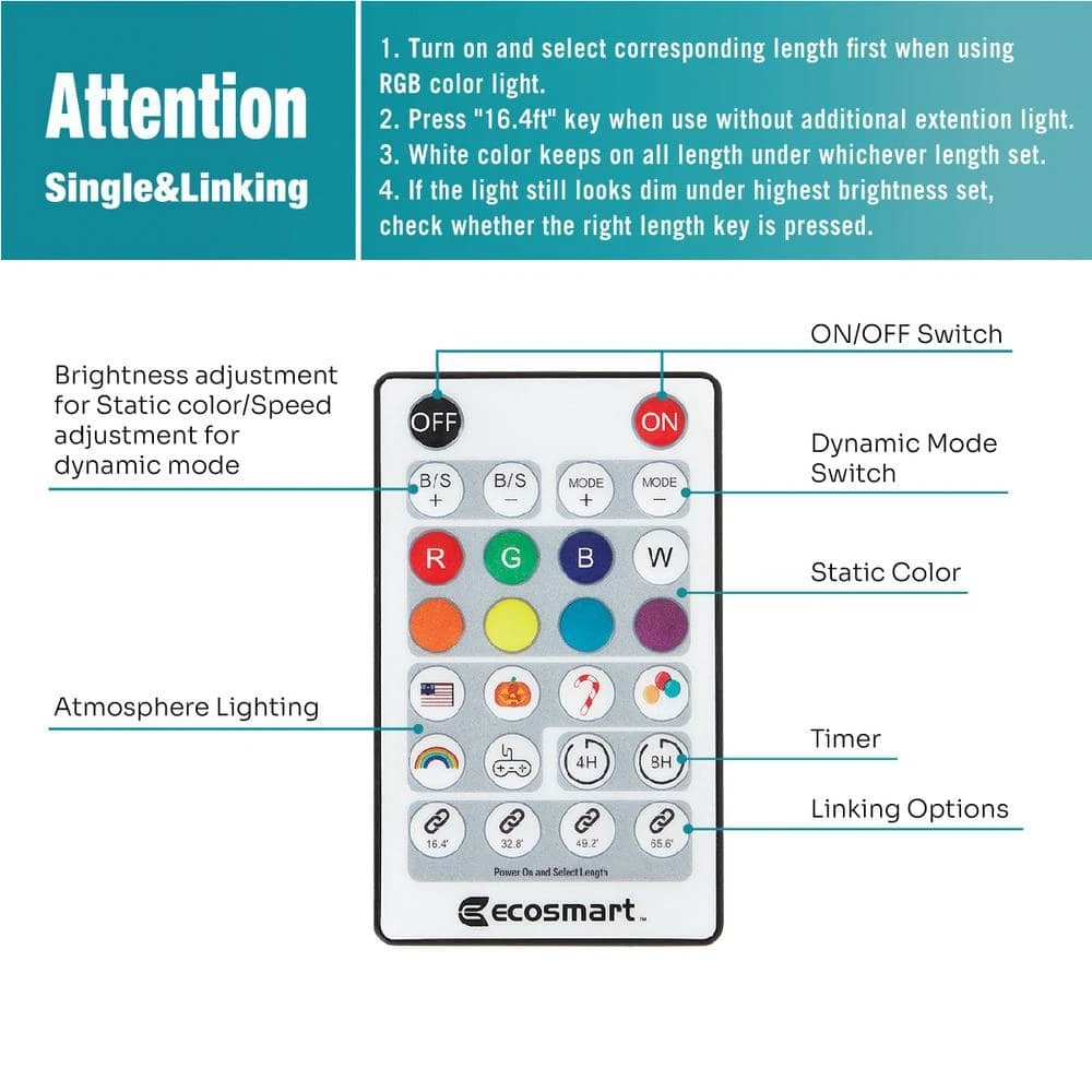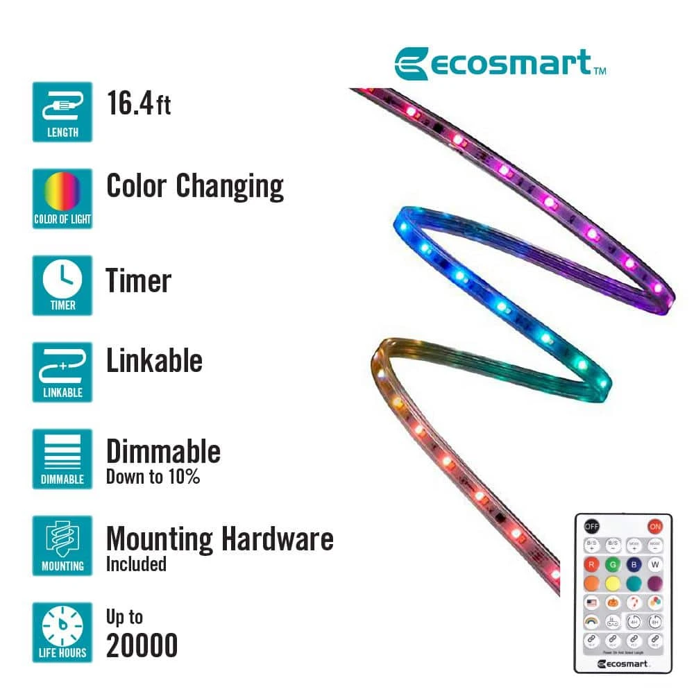 The EcoSmart 16.4 ft. RGBWIC Outdoor Tape Light can be used to brighten up any space with multiple dynamic color modes. The lights are wet rated so can be used both inside and out. Great for outdoor patios, pool areas, living rooms, bedrooms and office spaces. Includes remote control.