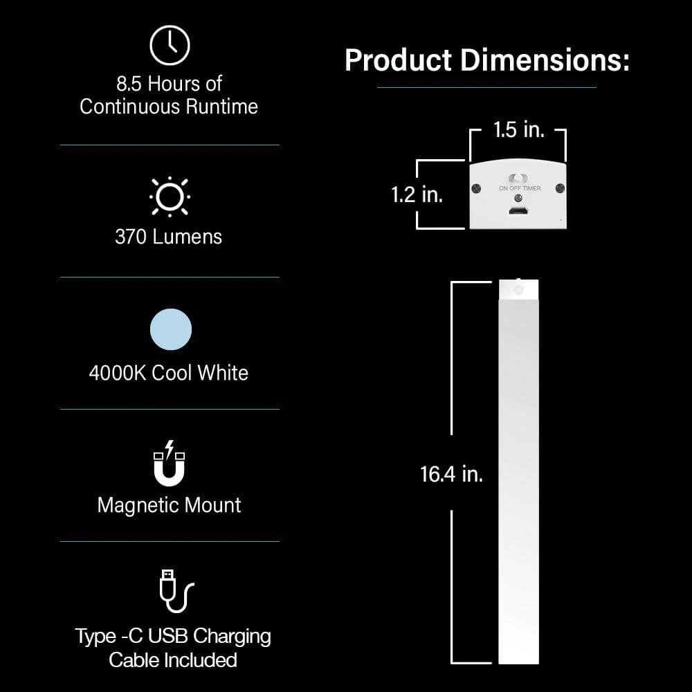 Add 4000K Cool White and 370 lumens of light with Feit Electric’s multi-function, 16.5 in rechargeable LED under cabinet light. They feature an innovative space-saving design that allows them to easily fit under cabinets, in workspaces and kitchens or other dark locations to provide extra illumination when needed. with the latest in LED technology, these lights use less power and energy compared to traditional undercabinet lights. Each undercabinet light is equipped with a rechargeable battery which means you won’t need to spend on replacement batteries or plug in the light to power up. When their 8.5-hour battery runs out, easily recharge it with the included USB charging cable and continue using. with easy self-adhesive installation, just peel off the tape and push to stick on most flat surfaces, there is no need for extra tools. The light connects to the mounting plate using built-in magnets and can be quickly detached to recharge. Give your kitchen a modern look easy with Feit Electric multi-function LED under cabinet lights.