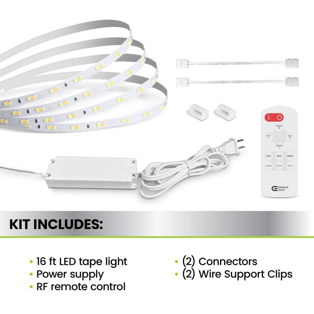 - Includes 16 ft. led tape light, power supply, remote control, connectors to bridge gaps and make turns, and wire mounting clips