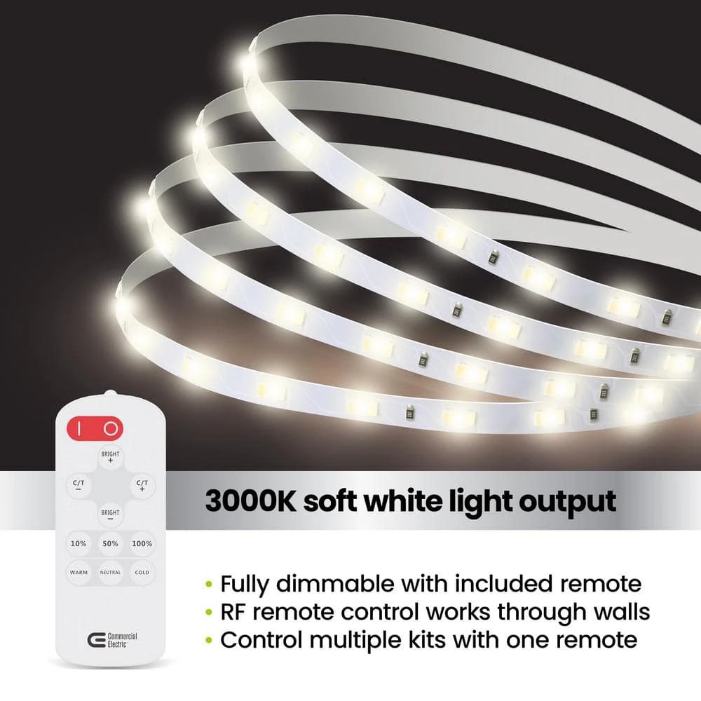 Add accent lighting to your home or commercial space with the TAPE192/CCT/HD Tunable White Tape Light. Measuring 16 ft. across, this flexible strip with embedded LEDs fits any size and angle. It emits up to 2835 Lumens of adjustable white light. Select your preferred color temperature between 2700K and 5000K for warm to cool lighting that fits any task or mood. Create a stunning backlight behind the television, add lighting under kitchen cabinets, or accent walls and stairs. Each unit comes with a remote for wireless control. Adjust the brightness and color temperature levels with precision from the remote or select from quick presets. High, medium, and low presets on the remote also let you quickly jump to your preferred brightness setting. This kit includes a peel-and-stick tape light, mounting clips, and corner adapters for customizable installation that fits any space. Cut the strip to fit smaller areas or link up to 2-lights together for greater coverage. This versatile tape light can be plugged in or hardwired directly into your home. Adjust the brightness with a wall dimmer switch when hardwired for smooth dimming without flickering. It uses only 36-Watts of electricity, for a brighter, energy-efficient alternative to standard 60-Watt incandescent bulbs. This bright, customizable light is the perfect addition to any space.