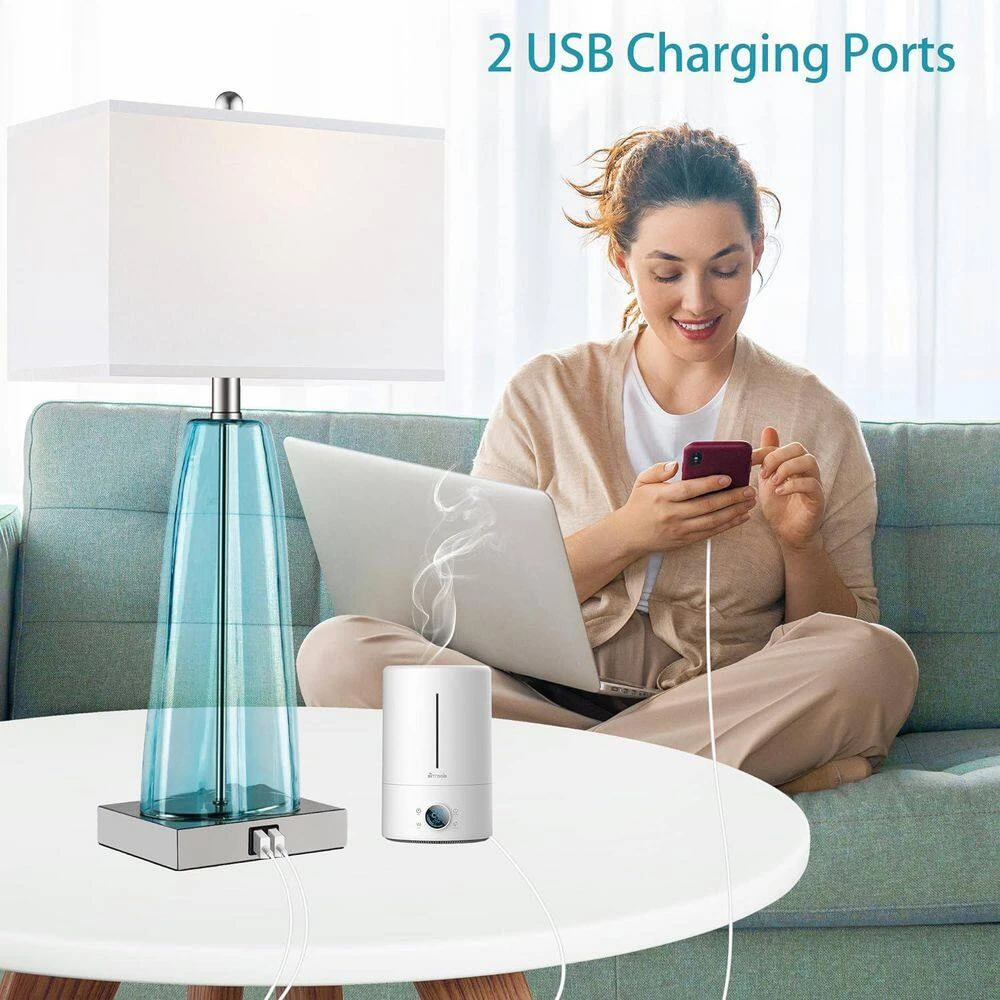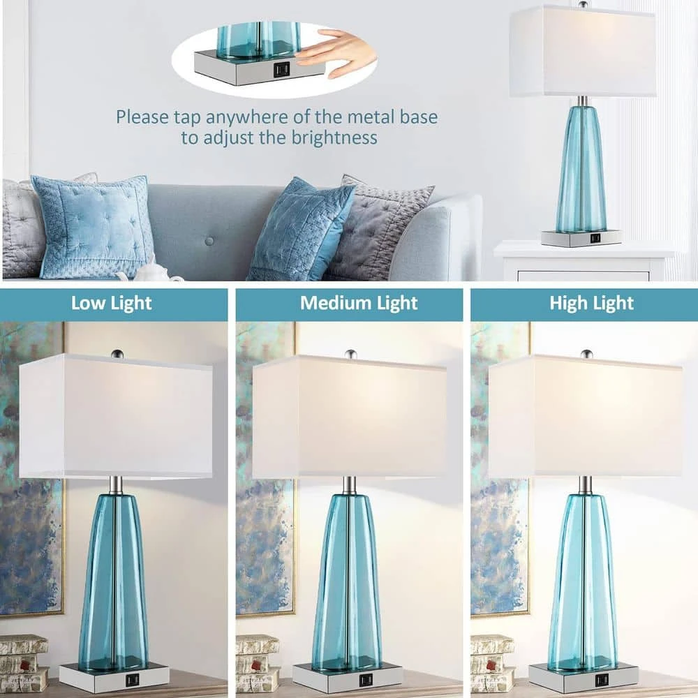 This modern coastal-style glass table lamp features turquoise rippled glass and a simple brushed nickel finish for a sophisticated and striking look. Paired with a rectangular white fabric shade, it offers a simple yet distinctive design. The lamp features three levels of brightness adjustment and touch controls to accommodate diverse lighting needs. A convenient USB charging port allows you to charge your electronic devices while you sleep or work. The included LED bulb brings a warm, cozy glow to your living space, and the easy-to-assemble design makes this table lamp an ideal addition to your home decor.