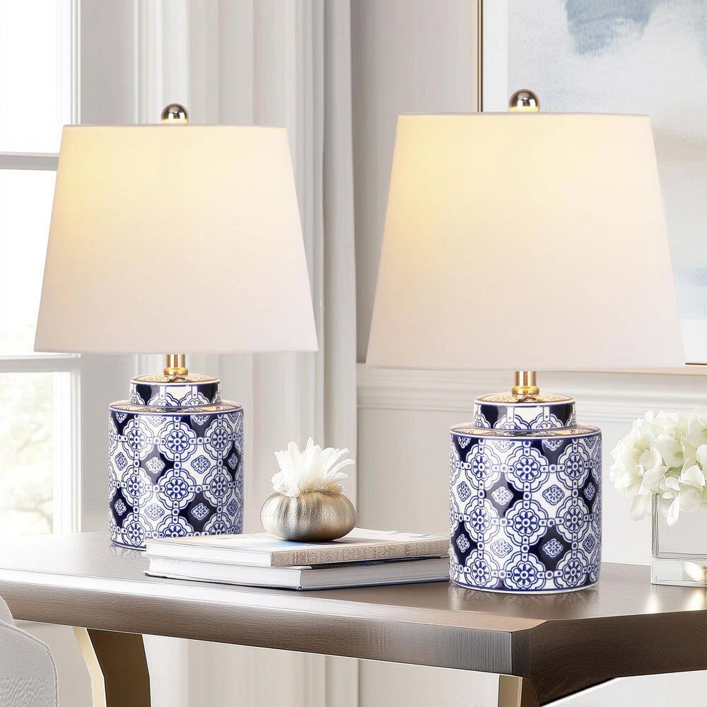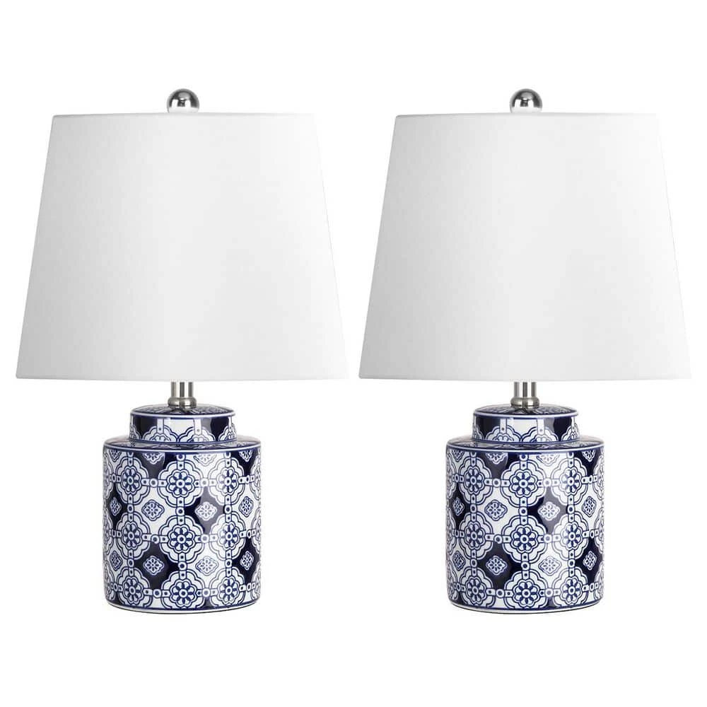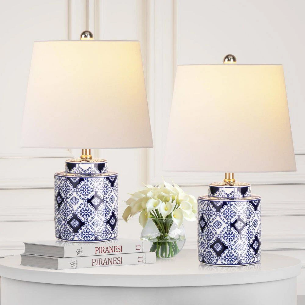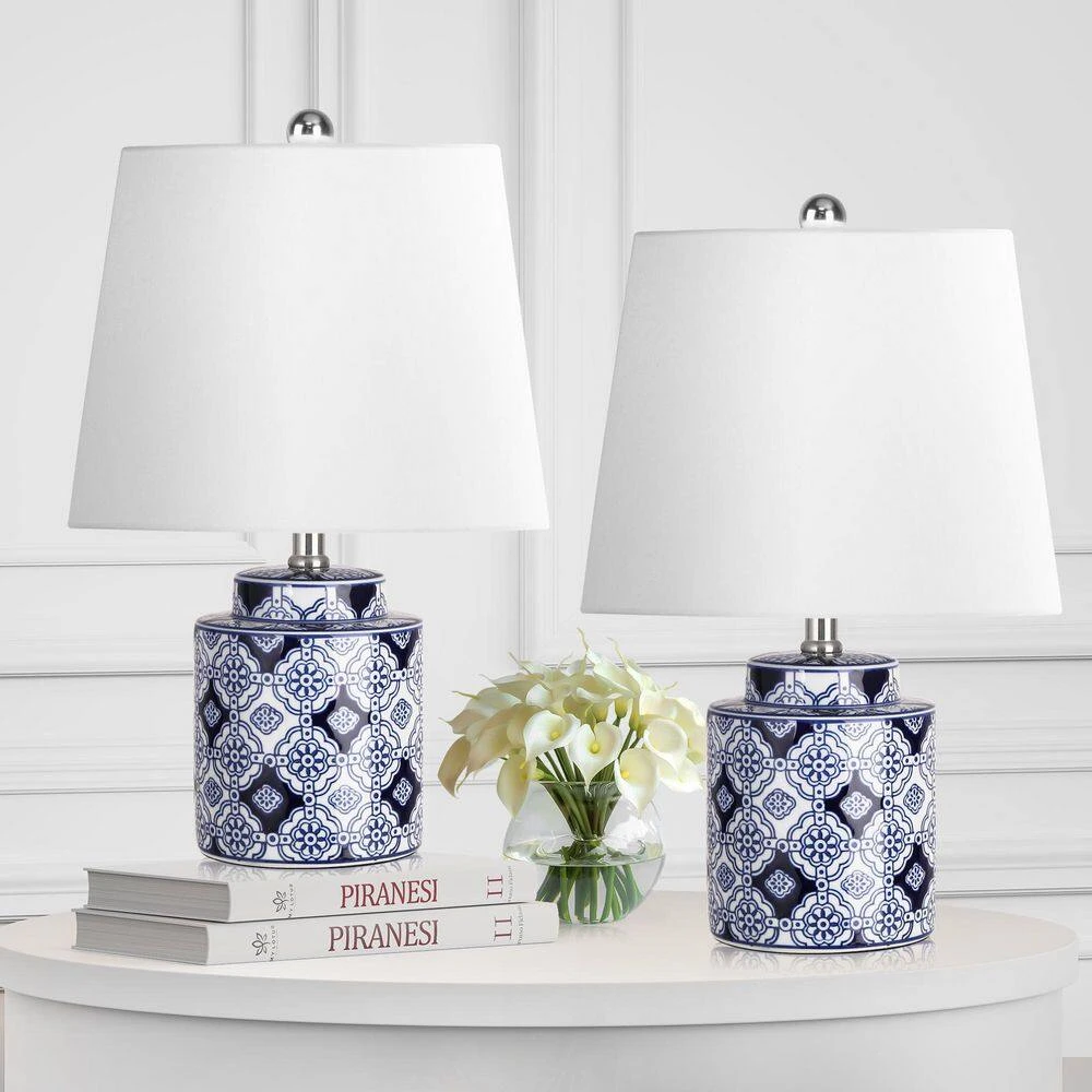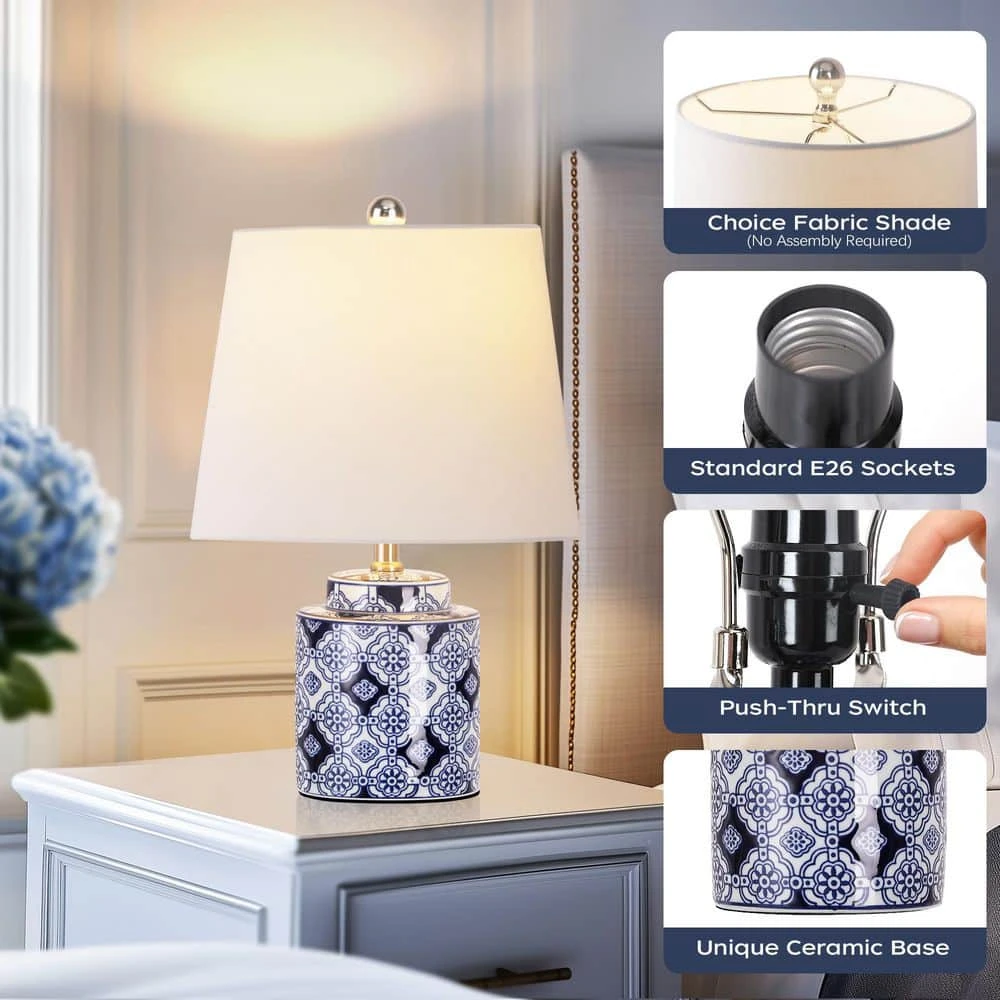 Crafted from smooth ceramic adorned with delicate blue motifs, this lamp combines timeless elegance with modern functionality. The durable knob switch allows for effortless light adjustment, while the intricate geometric patterns-paired with a white linen shade-emit a warm, inviting glow. A perfect accent piece to elevate your traditional decor with refined sophistication.