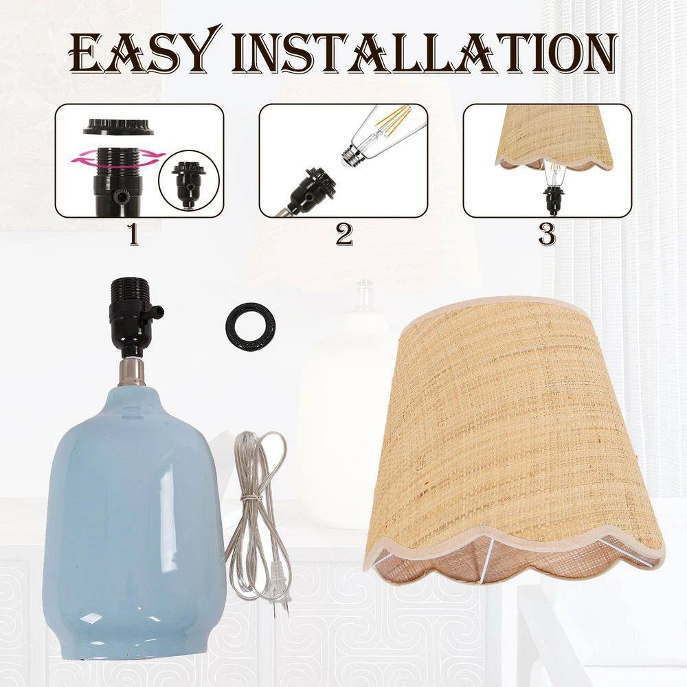 Very elegant table lamp, you may even count it as a piece of art. This table lamp has a smooth glazed ceramic finish on its body, with no extra decorations or any other colors, just plain. The lampshade is made from hand woven raffia grass, which shows natural vibe all the time, durable and neat. The edge of the lampshade is wavy, adds a different feel to this organic lampshade. It comes with a super convenient rotary switch, allows you to turn it off and on easily, requires one standard 60-Watts light bulb, which is not included in this product.