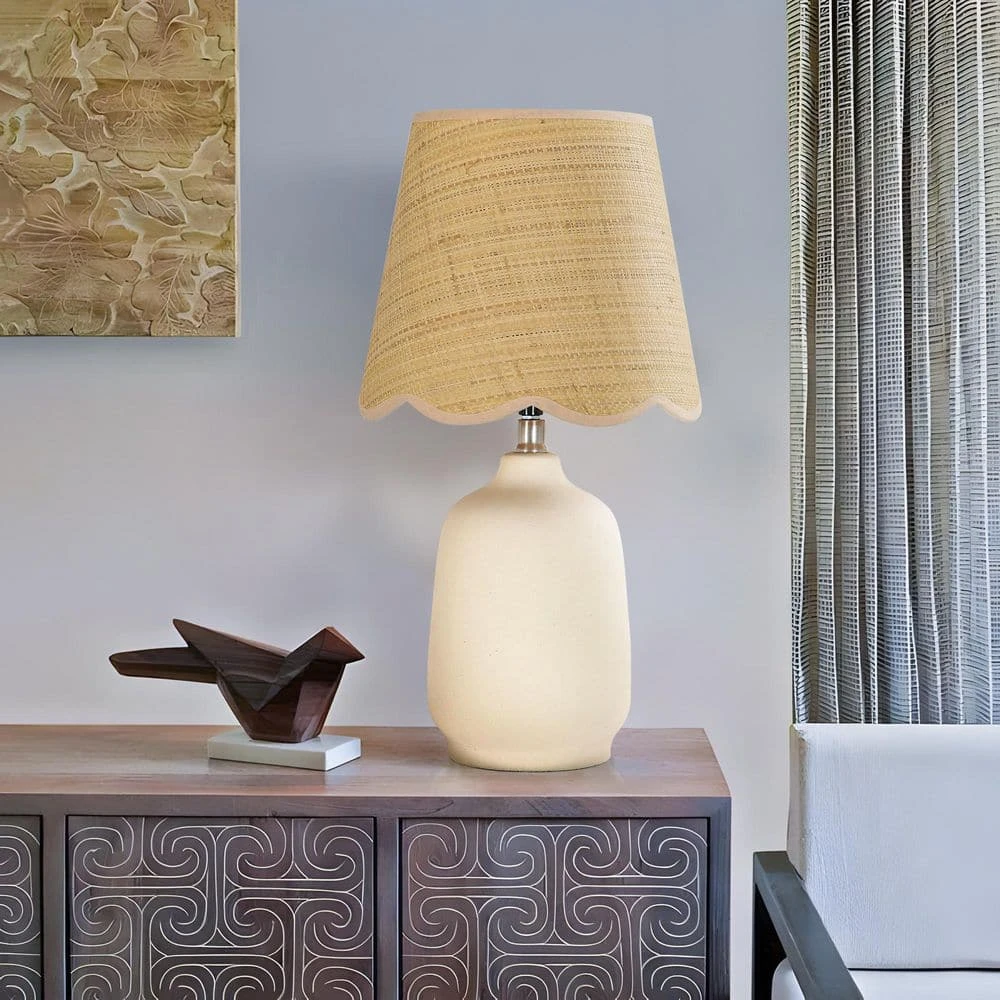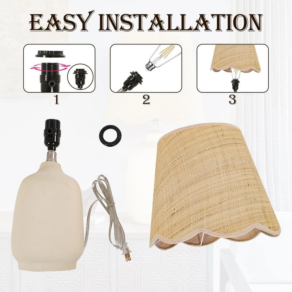 This modern, minimalist table lamp brings effortless elegance to any space. With its sleek, rounded lines and natural raffia grass woven lampshade, it softens the light, creating a warm, inviting atmosphere. The ceramic body, featuring a subtle, organic texture, adds a touch of artistry and a rich, grounded feel. Designed for easy assembly, you can have it up and running in just 5 minutes-no hassle. The standard socket ensures compatibility with 60 watts bulbs, and with UL certification, safety is guaranteed. A perfect blend of style and function, this lamp is sure to elevate any room with both charm and sophistication.