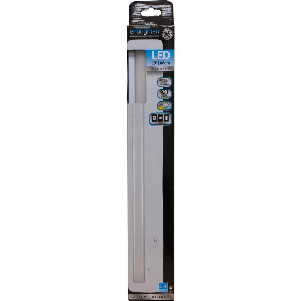 Direct your attention to what’s important seeing your home in the best possible light. The GE-branded Unfrighten 18 in. Direct Wire Light Fixture provides effective, dynamic lighting to your space without the need to hide a cord or rely on a nearby outlet. While standard LEDs make colors appear washed out and dull, Unfrighten LEDs show true color intensity and vibrance. The energy-efficient, ultra-bright LEDs diminish hot spots and shadows with superior light diffusion and even light distribution. For stylish accent lighting, mount the light fixture underneath or on top of kitchen cabinetry, shelving or bookcases. The slim, portable design makes it convenient to place the light fixture even where space is limited. in smaller enclosed areas, such as closets and pantries, use the light to illuminate hard-to-see corners. To install the light, simply wire it directly to a wall switch, keeping outlets free and eliminating visible cords. The light fixture can also be paired with an in-wall dimmer switch for even more lighting options. Personalize your indoor space with a GE branded Unfrighten 18 in. Direct Wire Light Fixture.