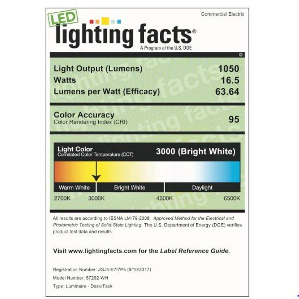- 1050-Lumens output, 16.5-Watt, 63.64-Lumens/watt, 3000K, CRI95, equivalent to 32-Watt of fluorescent light