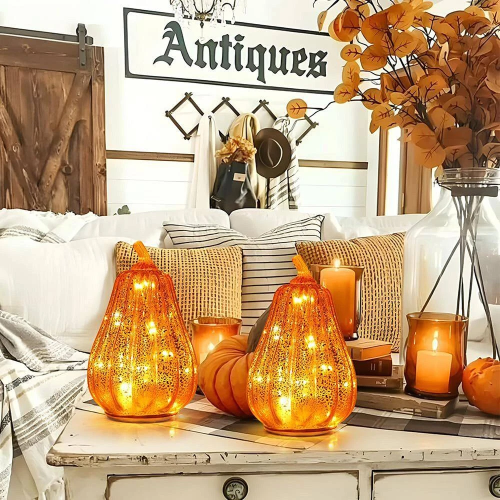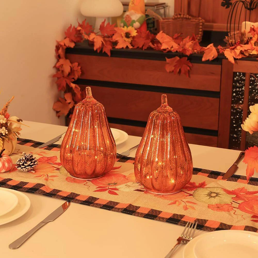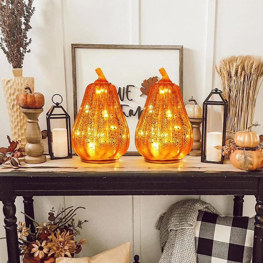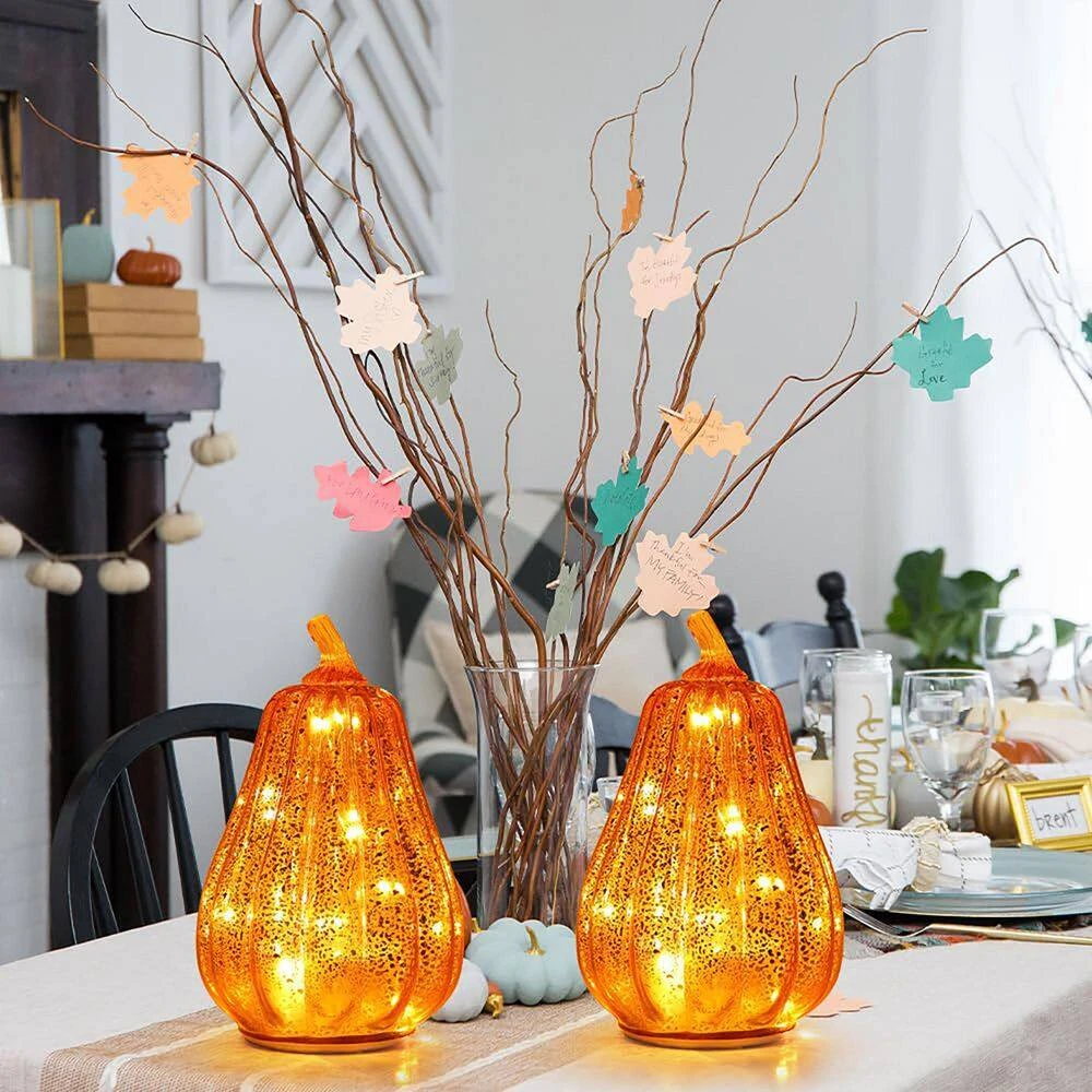 Fall Decorations for Home, Set of 2 Glass Pumpkin with LED Lights are Thanksgiving table decor, and these timer lighted pumpkin decorations are suitable for indoor fall mantel decorating.