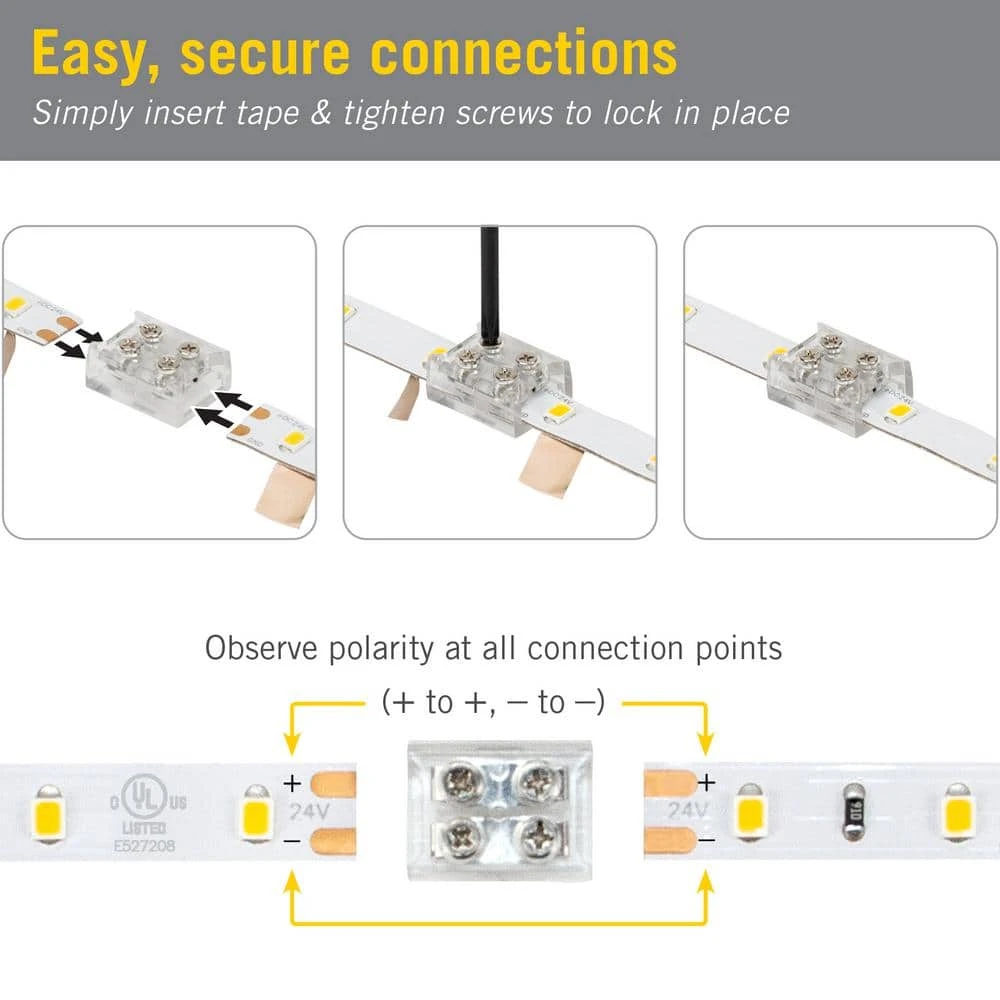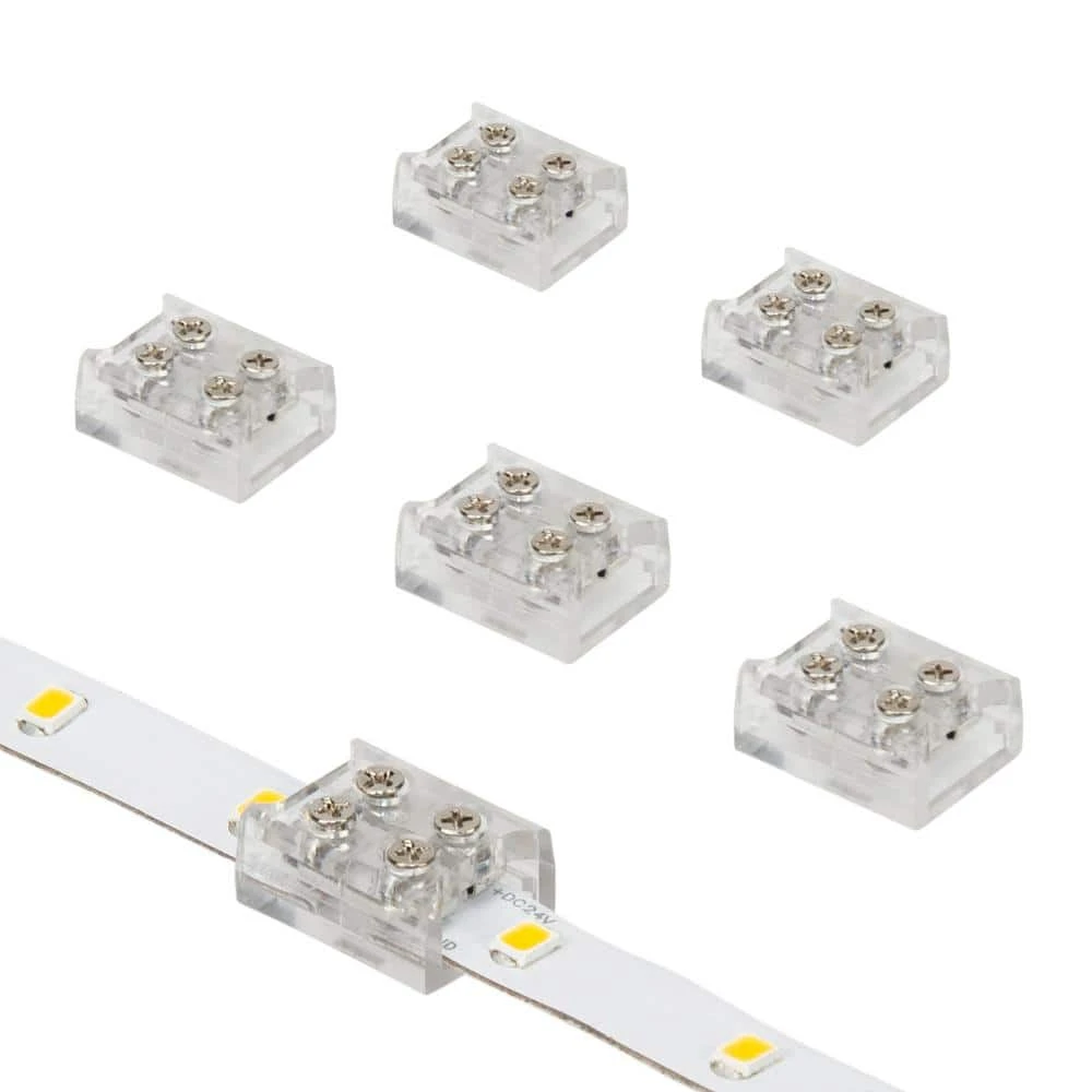 Create foolproof strip-to-strip connections with Armacost Lighting’s 2-Pin Screw Splice LED Tape Light Connectors. Featuring mechanical screws to clamp tape light for an extra-secure connection. Use the splice connectors on two sections of white or single color 2C LED strip light. Be careful to observe tape light polarity at all connection points.