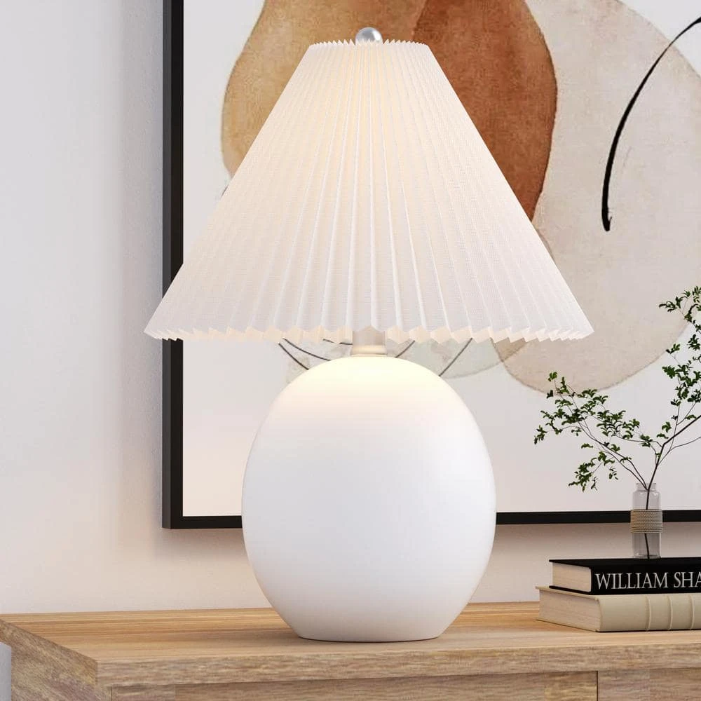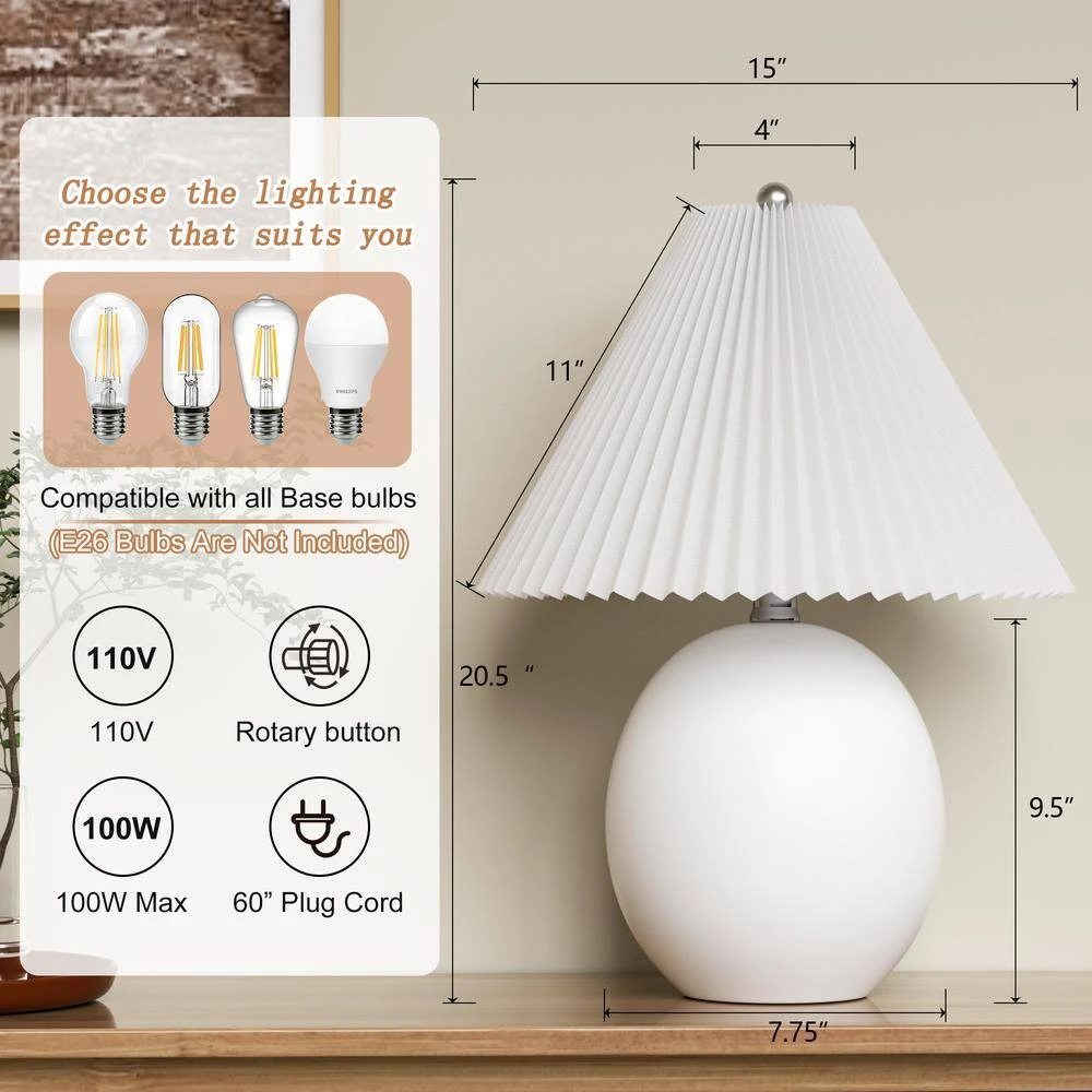 This classic table lamp features a simple and elegant design that fits various interior decor styles. The lampshade has a pleated design that adds visual depth while softly diffusing light to create a warm atmosphere. The smooth, rounded lines of the lamp body have a delicate texture, making it ideal for placement in a bedroom, living room, or study, enhancing the overall comfort and taste of the space. It is ETL certified to ensure safety during use, and the product comes with a 1-year warranty.