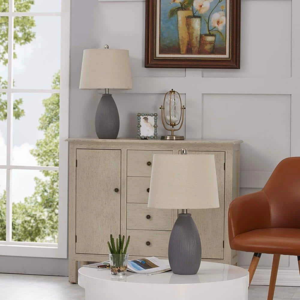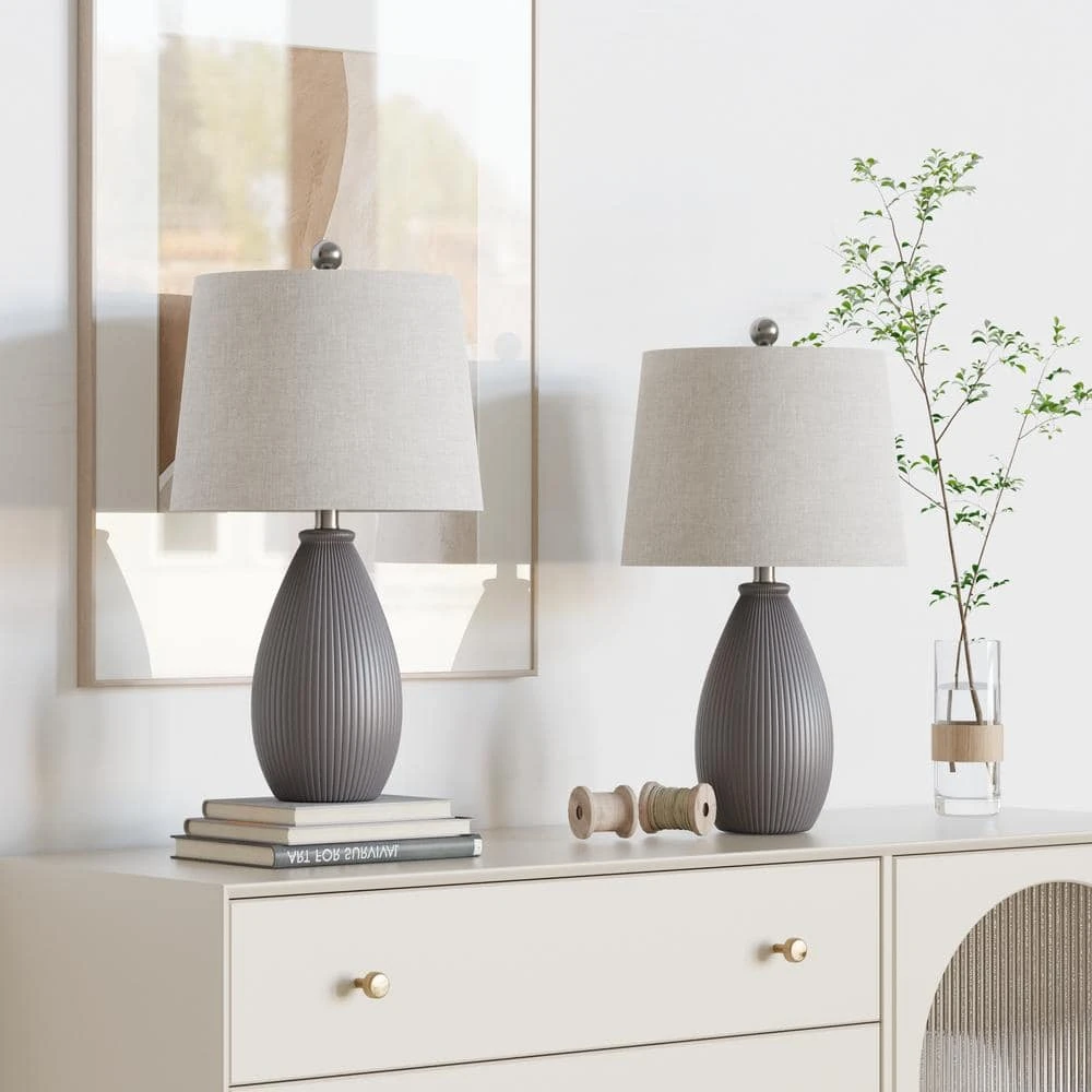 Combining modern simplicity, rusticity and artistic elements, this table lamp features a teardrop design as the lamp body and a characteristic pattern on the gray-finished ceramic body, perfect for modern farmhouses and home decor. The oatmeal-colored linen shade was chosen for its light transmission and is paired with a three-way switch for simplicity and speed to better meet basic daily lighting needs, and is the perfect choice for a modern table lamp. Maxax is a global brand with UL-listed products that create superior lighting fixtures with safe and consistent quality, and this product is sold as a 2-piece set.