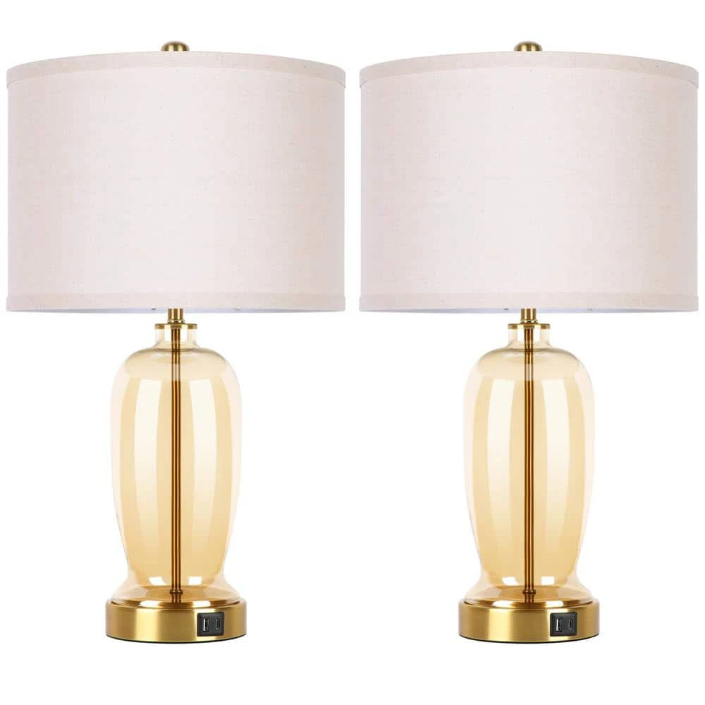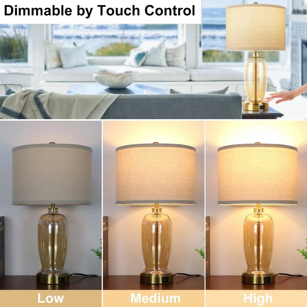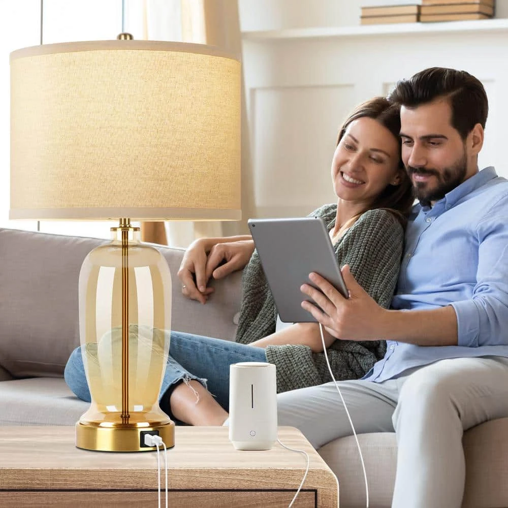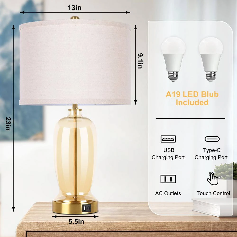 This table lamp is 23 in. tall, its body is made of a gold metal base and translucent glass with a classic beige shade. This contemporary and modern design will suit most decorating styles. Perfect for placing our paired table lamps in your bedroom, living room, nightstand, or side table. Adopted touch control design, only need to press the base touch switch, can adjust the brightness of 3 levels (low, medium, high) and on/off. It can make you get rid of the trouble of fumbling the switch in the dark, especially when you wake up in the middle night. Our 3 Way Dimmable nightstand lamp comes with an LED bulb. This high quality bulb have long enough lifespan and energy savings. The lamp is equipped with 1 USB-A port,1 USB-C port,2 AC outlet which provide enough charging ports for devices. You can charge your phone, watch, or other devices at the same time while you sleep or read. Don’t bother about not having enough outlets.It easy to assemble. it only takes minutes to install all the parts together following the instructions.