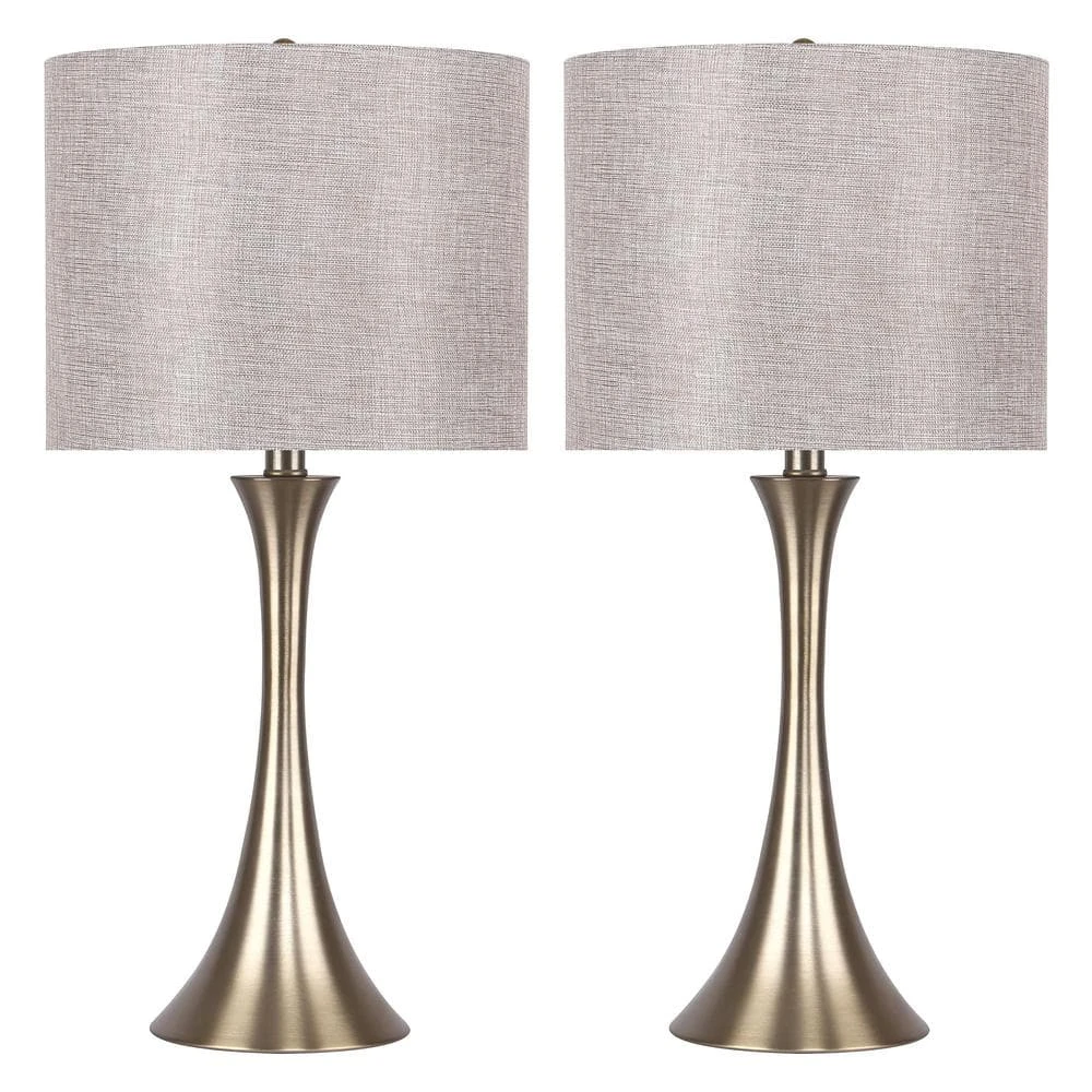 Add sleek modern style to your space with this pair of gold-plated table lamps by GRANDVIEW GALLERY, which feature a beautiful round base that elegantly curves up into a lovely hourglass body. Each lamp is topped by a gold-plated finial and a drum shade wrapped in golden metallic linen fabric, creating a lamp that is versatile yet stylish. Whether resting on your nightstands, set on a side table in the den, or tucked into your favorite reading nook, this lamp is a chic addition to any aesthetic.