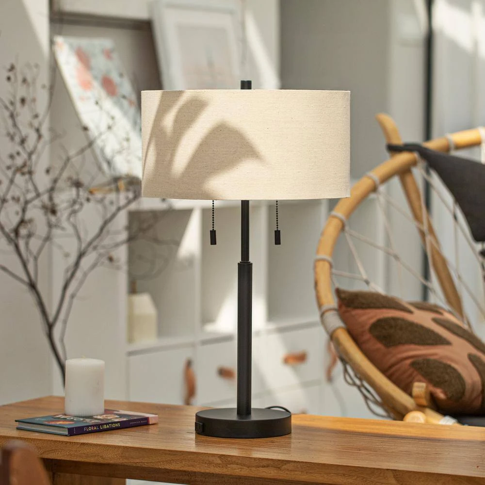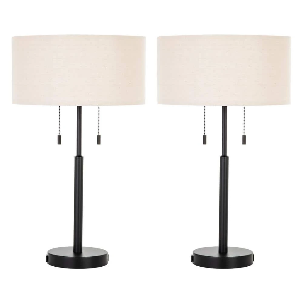 Our set of modern table lamps is a beautiful and helpful addition to any home, office, or dorm room thanks to its classic design and convenient charging station. Standing 24 in. tall, these aesthetic lights will brighten your space and your life whether needed for office desks, hallway side tables, bedroom night stands, or living room end tables. Softened by their natural linen lamp shades, our desk lamps have a retro modern look that imparts a timeless elegance to home decors from rustic farmhouse to industrial minimalist. The two E26 sockets on each of these twin lamps accommodate any incandescent, CFL, or LED light bulbs up to 60W; each bulb is separately controlled by its own pull chain to allow more lighting options. Each desk lamp also comes with a built-in USB port and 2-prong AC outlet to let you easily charge your personal electronic devices. Enjoy this pair of helpful lamps around your own home or use them as a friendship lamp set for housewarming, birthday, and Christmas presents for friends and family.