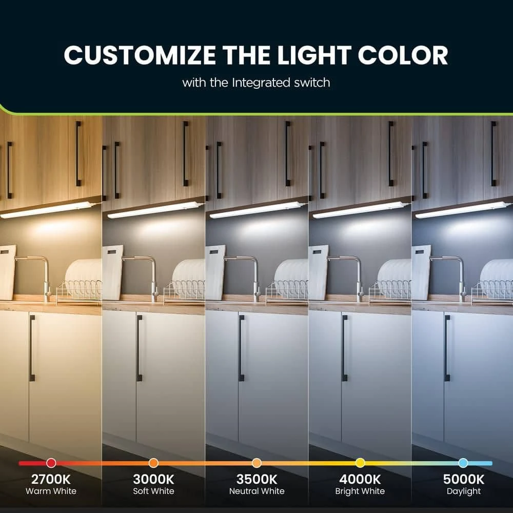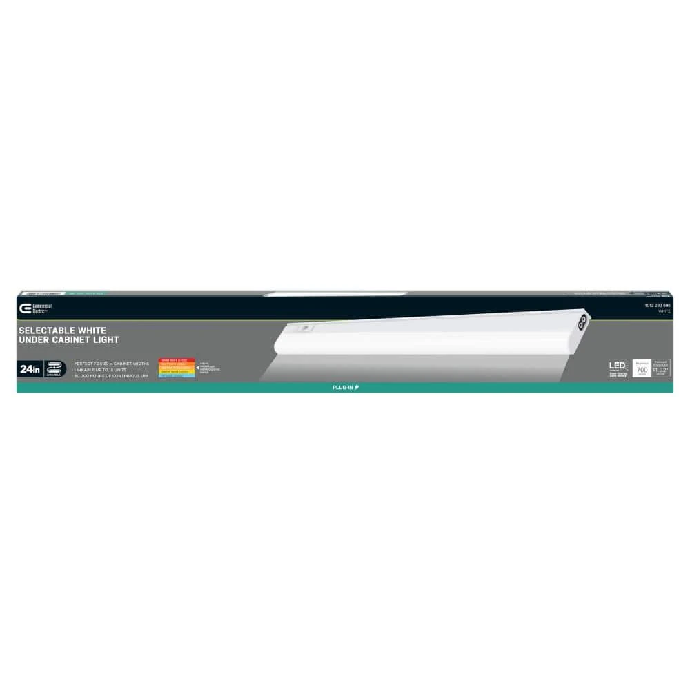 Upgrade your undercabinet lighting with the perfect solution for prep spaces, the Commercial Electric 24 in. Plug-In LED Undercabinet Light. This versatile light offers a variety of features to customize your kitchen or workspace. Easy slide switch allows you to choose from 5 color temperatures to customize your lighting for any task or mood. Select from 2700K, 3000K, 3500K, 4000K or 5000K, with High and Low dimming options at each color temperature. The included end-to-end connectors and 15 in. linking cable allow for the connection of multiple lights together (up to 18 units) to span wider areas. Easy plug-in installation with a 5 ft. power cord eliminates the need for hardwiring. Replace older incandescent lighting with long-lasting LED for up to 50,000-hours of bulb life and energy-efficient operation. It’s the perfect addition to kitchens, workshops, laundry rooms and anywhere you need additional task lighting or a touch of ambient light.