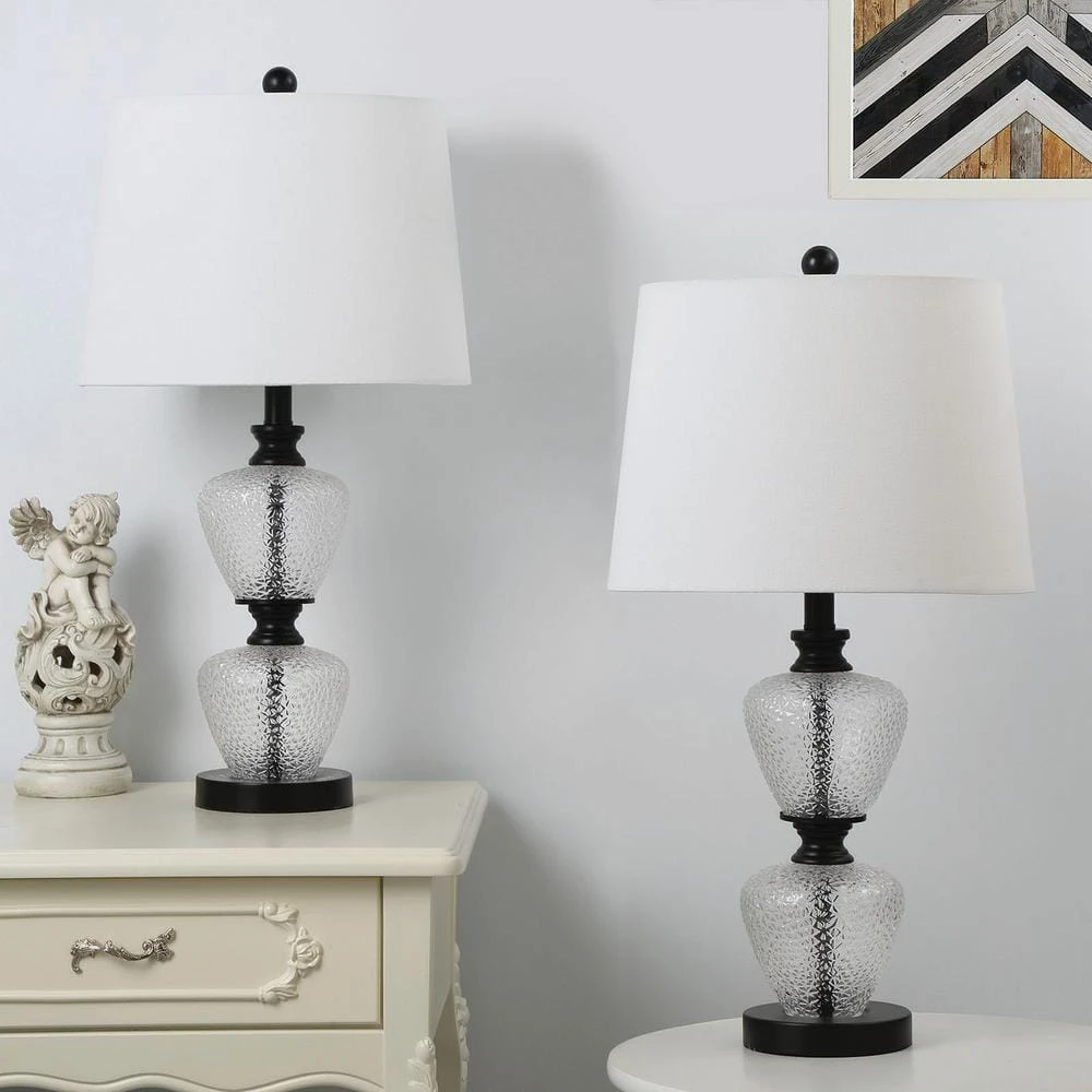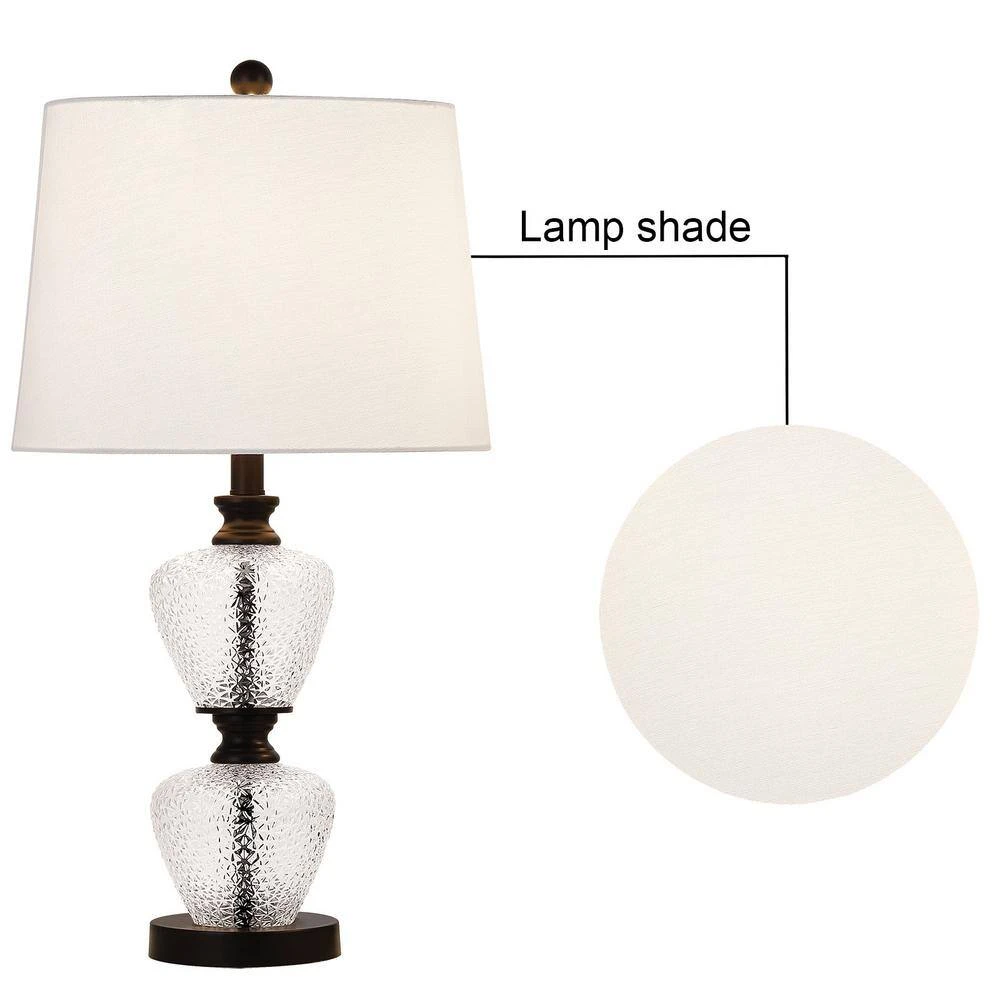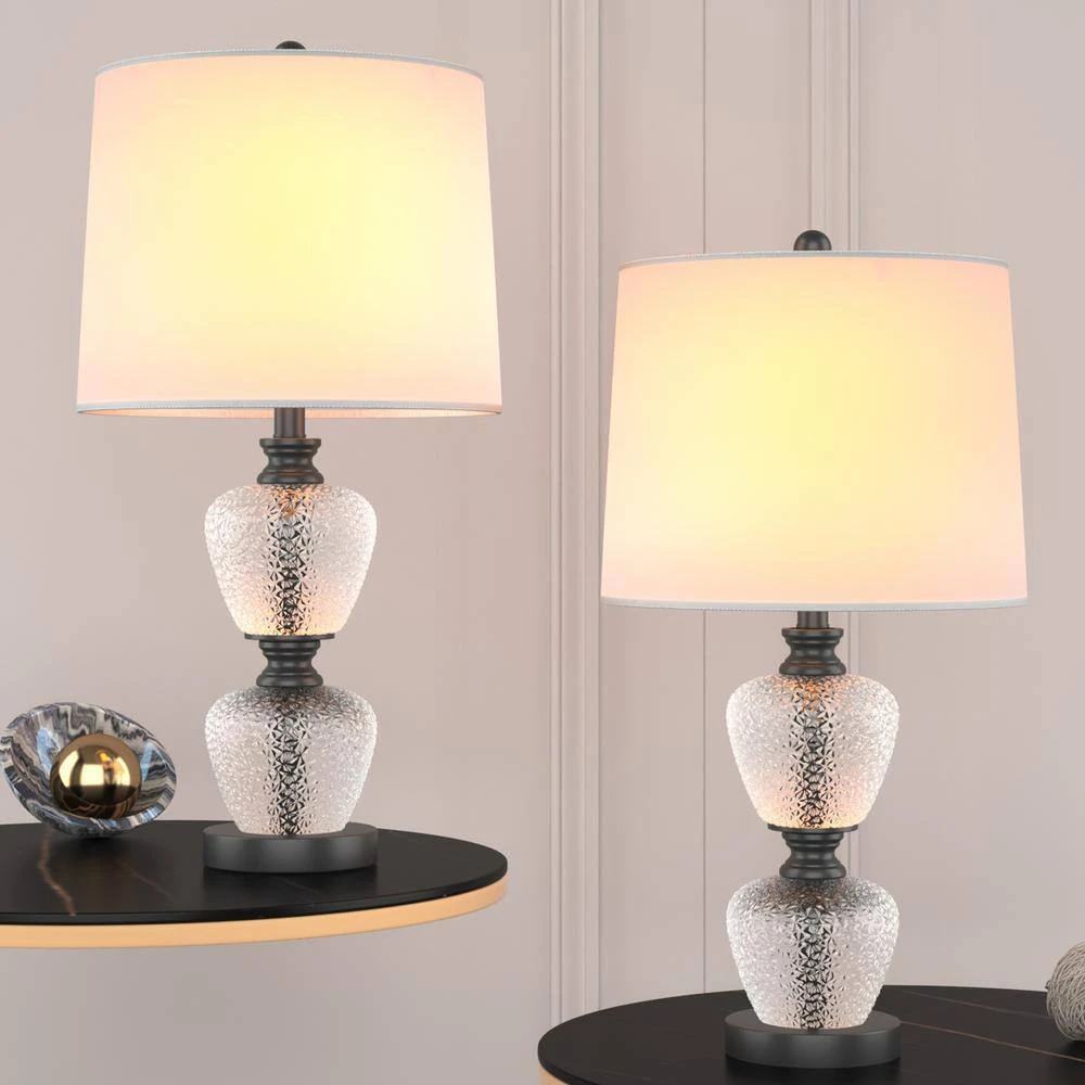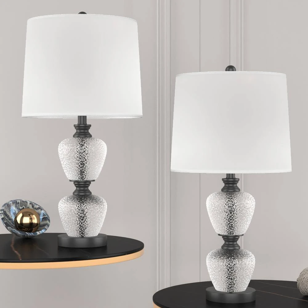 A modern table lamp sold in a 2-pack with a clear glass body in a black finish that blends modern industrial, classic and artistic elements, perfect for modern home decor. Choose white drum shade, soft light, strong light transmission, with three-way switch, simple and fast, can better meet the basic daily lighting needs.Maxax is a global brand with UL certified products, creating superior lighting fixtures with safe and stable quality.