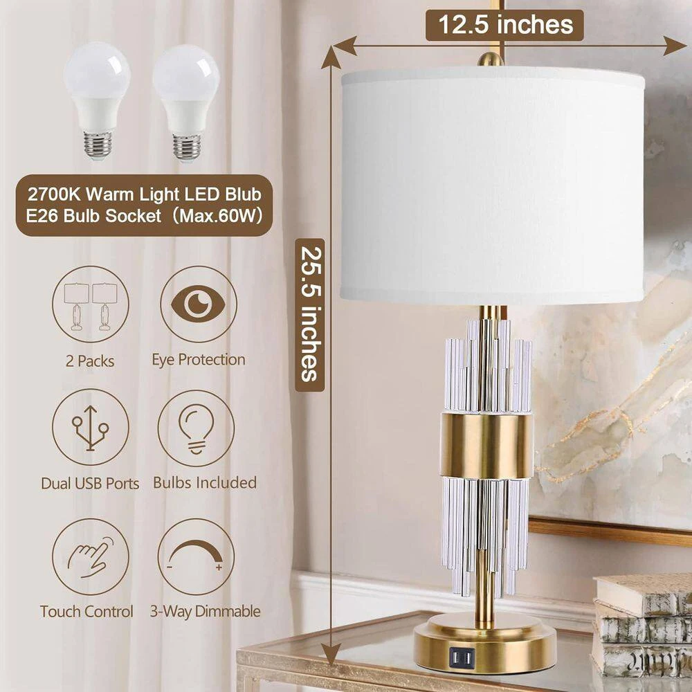 - Modern elegance looks design: the slender gold lamp holder comes in a brass finish to give the bedside lamps an exquisite and gorgeous golden look, and a decorative accent made of many clear acrylic sticks wraps around the center for an element of visual interest the top of the lamps comes with a white fabric drum shade for a clean finishing touch designed to illuminate your home with warm light and makes an artistic stylish addition to any living room, dining room, bedroom, entry or officekindle, or laptop while you lying on your bed
