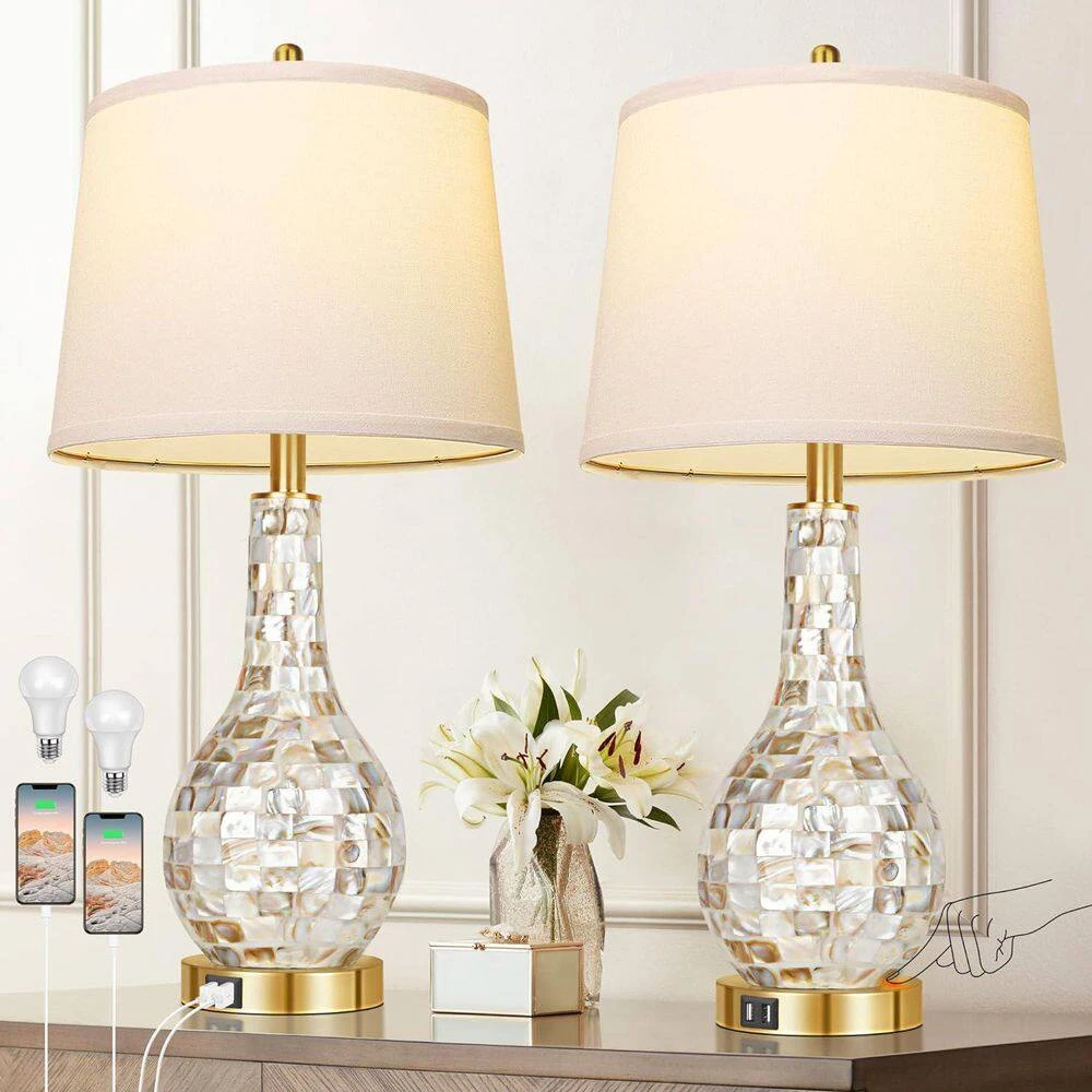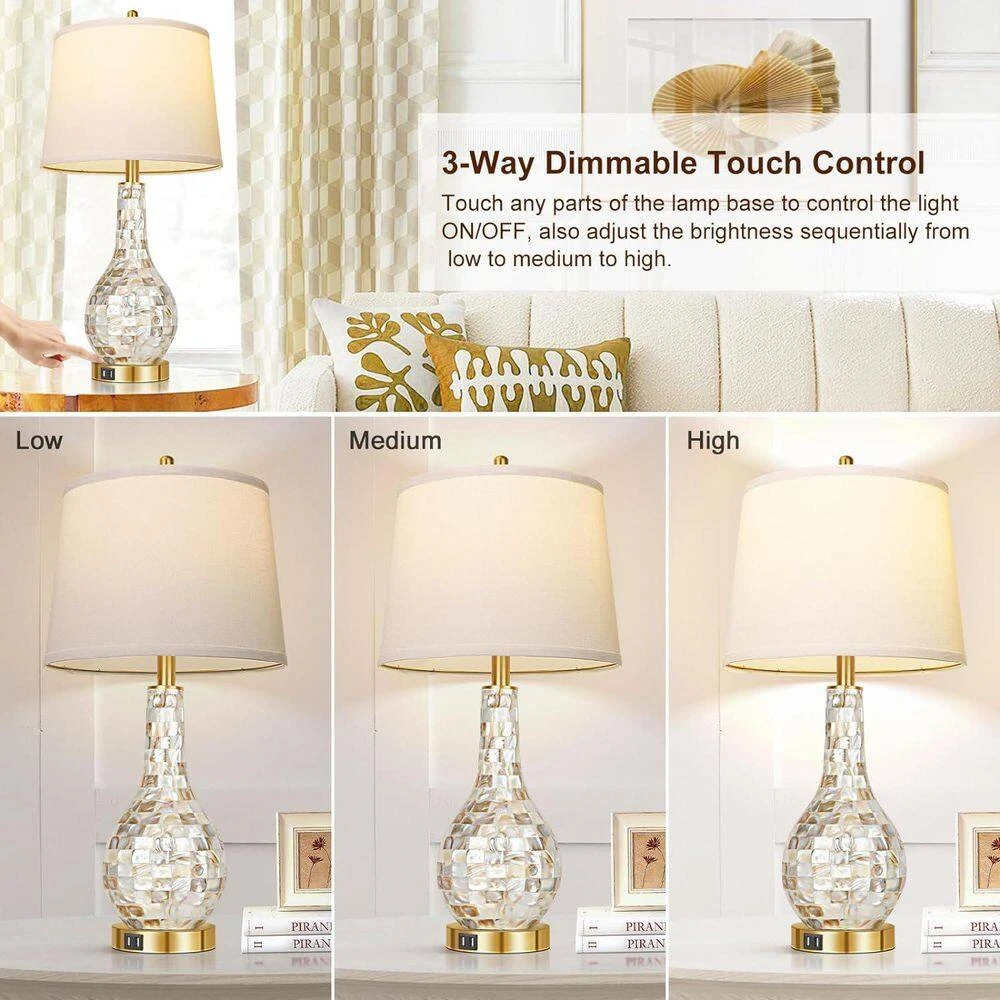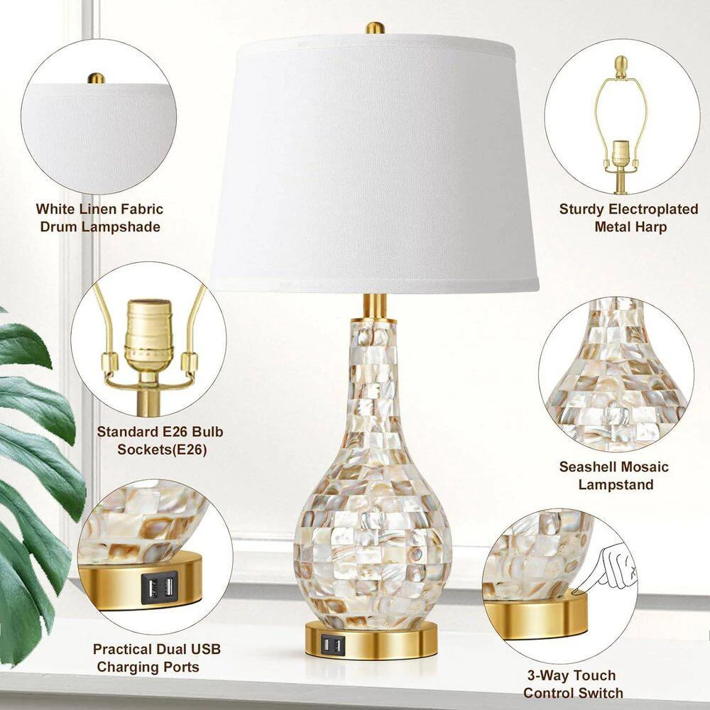 - Quality construction: the white linen lampshade of the bedside lamp can distribute the light evenly and soften the light to reduce light damage to the eye. The metal parts of the gold lamp adopt the electroplating process to make the lamps for bedroom sturdy. The metal base to prevent the living room lamp from tipping. The color and pattern of the natural material on every shell tile will vary. Showing unique beauty, shining different brilliance from different angles.