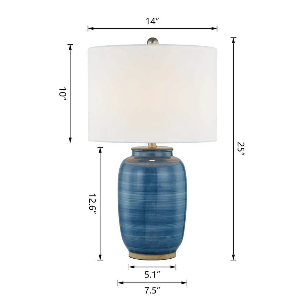 - Assembly size: 25 in. H x 14 in. W x 14 in. D, lampshade size: 14 in. W x 10 in. H, lamp body size: 12.6 in. H x 7.5 in. W, total cord length is 46 in.