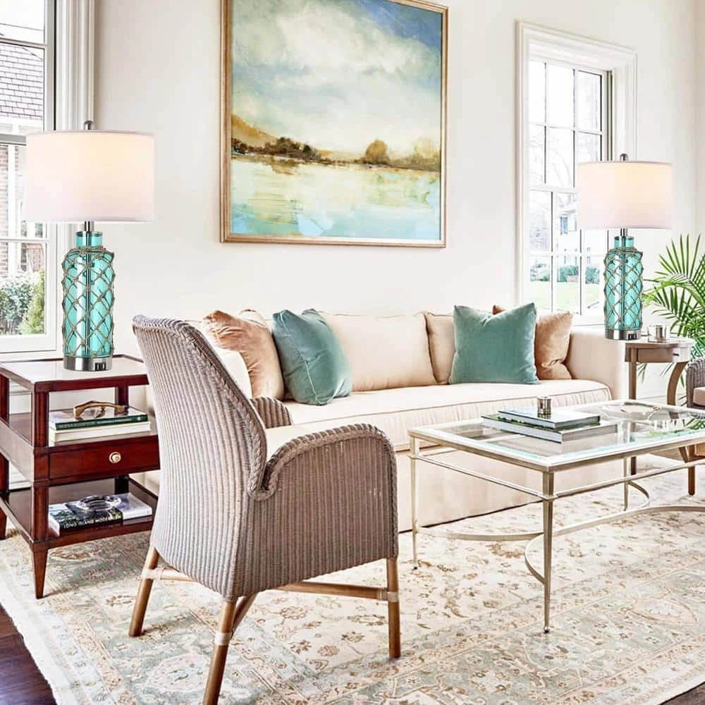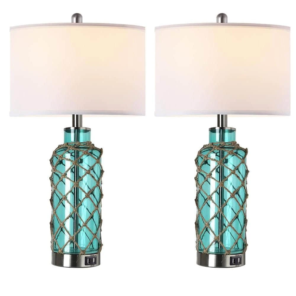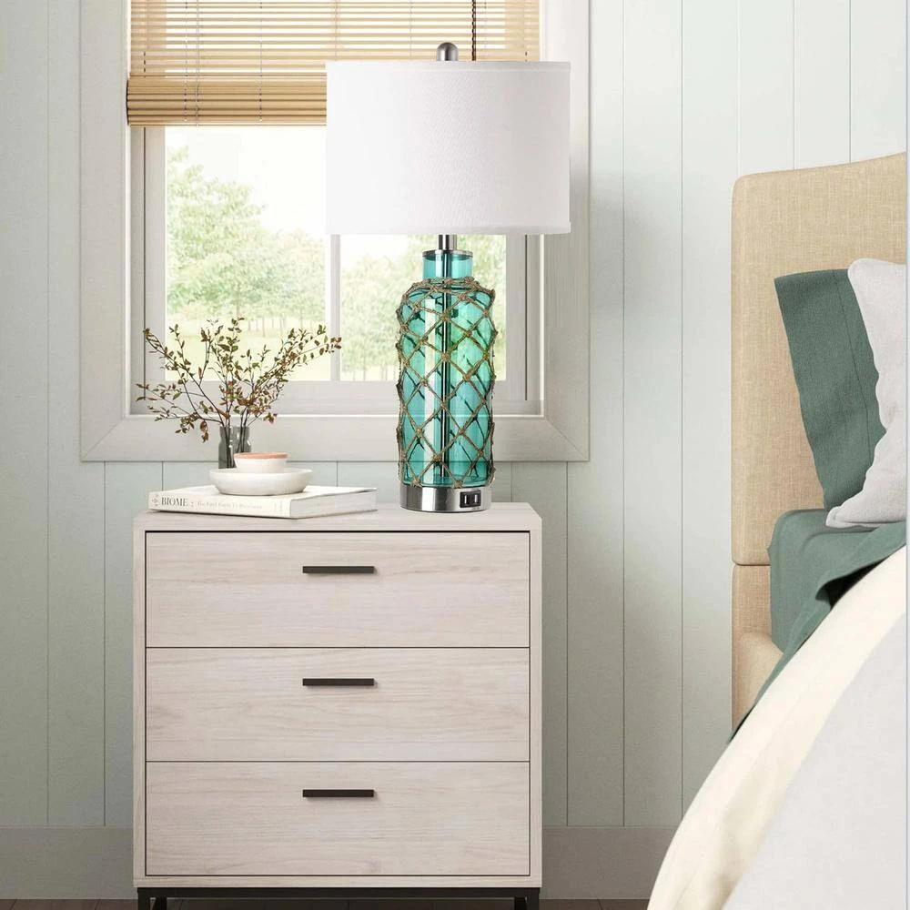 - End table lamps designed with a transparent blue glass bottle vase accented by rope netting, this cottage-style table lamp is paired with a brushed nickel base and topped with a white drum shade, giving you a relaxing coastal mood, white fabric lampshade softens the light and provide comfortable and natural light, no flicker, no dazzle, have an effect on preserve eyesight