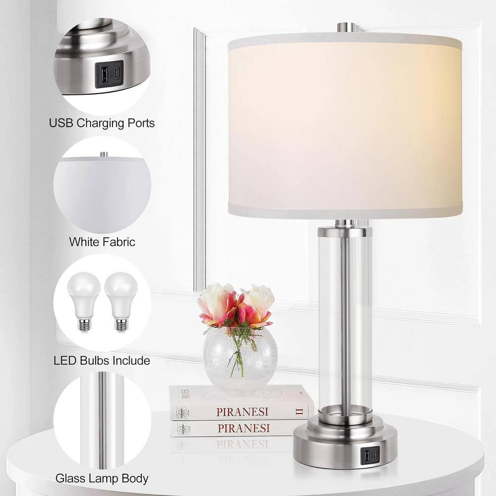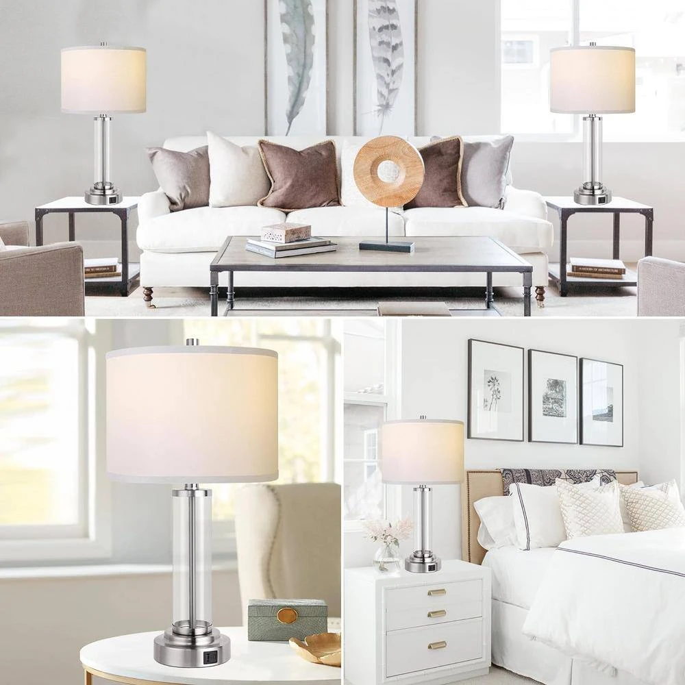 Add a stylish touch to your space with this set of 2 modern nickel table lamps. Featuring 3-way dimmable lighting and built-in USB charging port, it’s perfect for bedrooms, living rooms, and offices. The clear glass and nickel base paired with the fabric lampshade emit a soft, warm glow that complements modern decor. The soft light relieves eye fatigue and is perfect for living rooms, bedrooms, and studies. A perfect gift for family and friends.