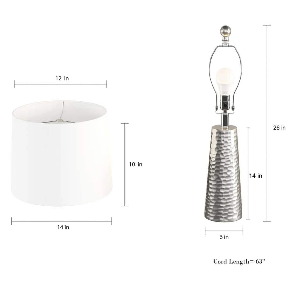 Instantly transform your space with stylish form and function with this elegant and unique 26 in. Hammered Metal Table Lamp (Set of 2) from Lavish Home. With a beautiful yet sturdy drum shaped, hammered metal base and ivory fabric shade, the lamps provide warm ambient lighting for your bedroom, living room or home office. The lamps conveniently come with energy-saving replaceable LED lightbulbs. It’s a perfect matching 2-piece set that will add a modern rustic touch to the nightstands or end tables in any room.