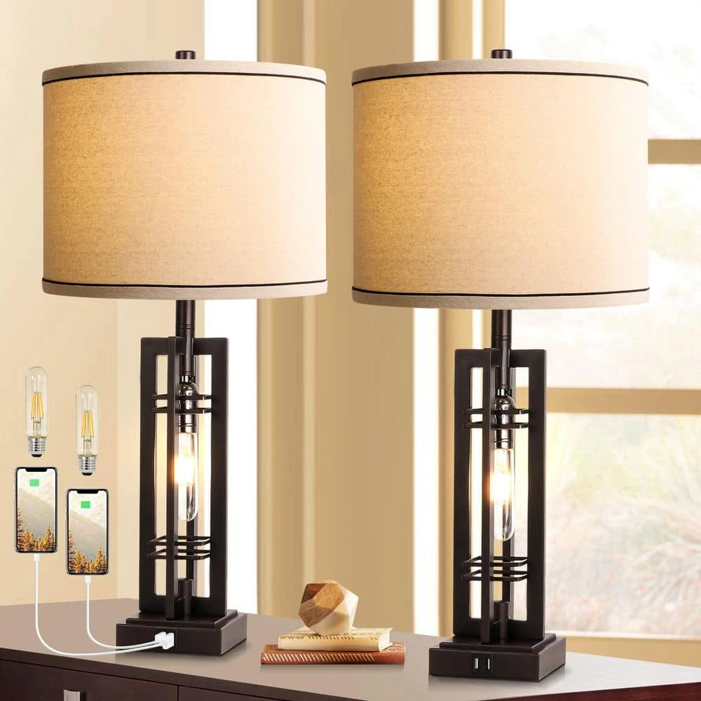 - The two light sources can be lit through two push switch on the rustic table lamp, allowing for either both lights,the main light or the night light to be in use. This table lamp with usb port is perfect for a bedside table in a living or study area. The bronze finish, natural shade,and Edison nightlight bulb work seamlessly together to create a beautiful lamp that boasts both industrial and rustic style.