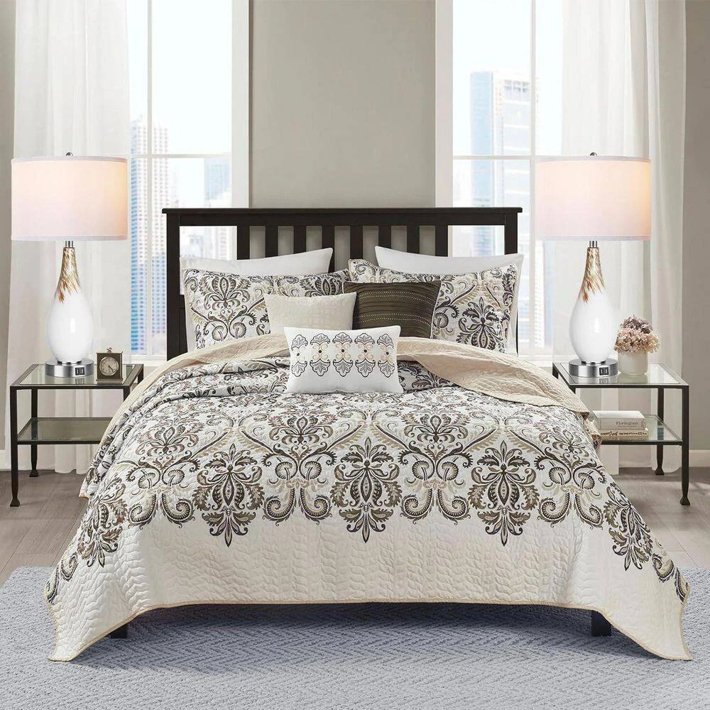This modern table lamp is made with handcrafted art glass and features brown and light gold tones. It is complemented by a brushed nickel finish metal and a white lampshade. Creating a stylish ambiance that adds radiance to your room.