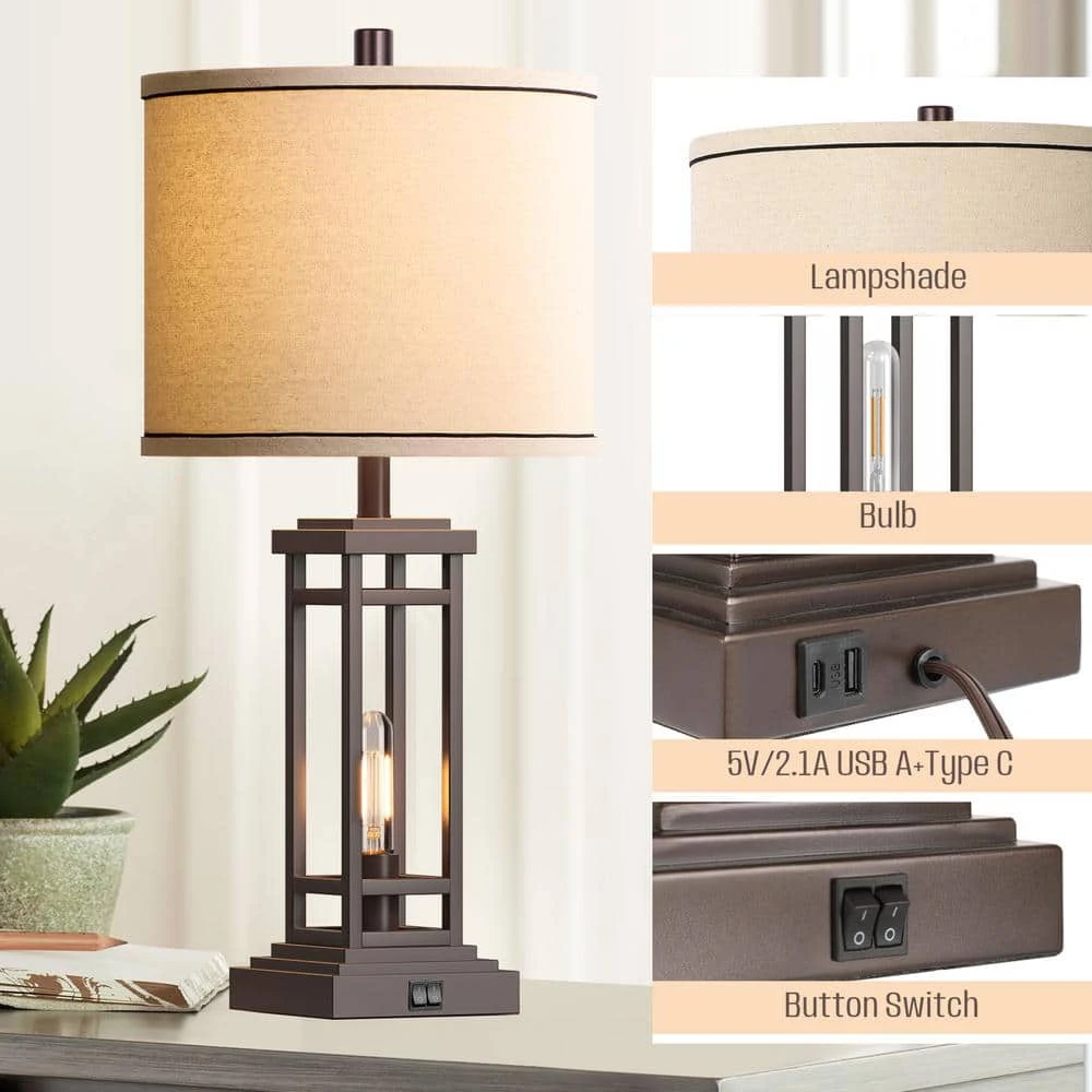 - Separate push summarys for different occasions: the 2 light sources can be lit through 2 push switch on the rustic table lamp, allowing for either both lights, the main light or the night light to be in use, this table lamp with USB port is perfect for a bedside table in a living or study area, the bronze finish, natural shade, and Edison nightlight bulb work seamlessly together to create a beautiful lamp that boasts both industrial and rustic style