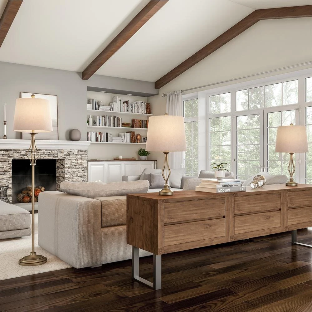 Instantly transform your space with stylish form and function with this elegant 27 in. Modern Rustic Curved Openwork LED Table Lamps and 61.5 in. Floor Lamp in Distressed Gold (Set of 3) by Lavish Home. With a graceful curve design in stylish distressed gold finish and natural linen tapered drum shade, the transitional accent lamps provide warm ambient lighting for your entryway, bedroom, living room or home office. The sturdy lamps conveniently come with energy-saving LED light bulbs. It’s a perfect matching 3-piece set with two table lamps and a standing floor lamp that will add a refreshing touch to your space.