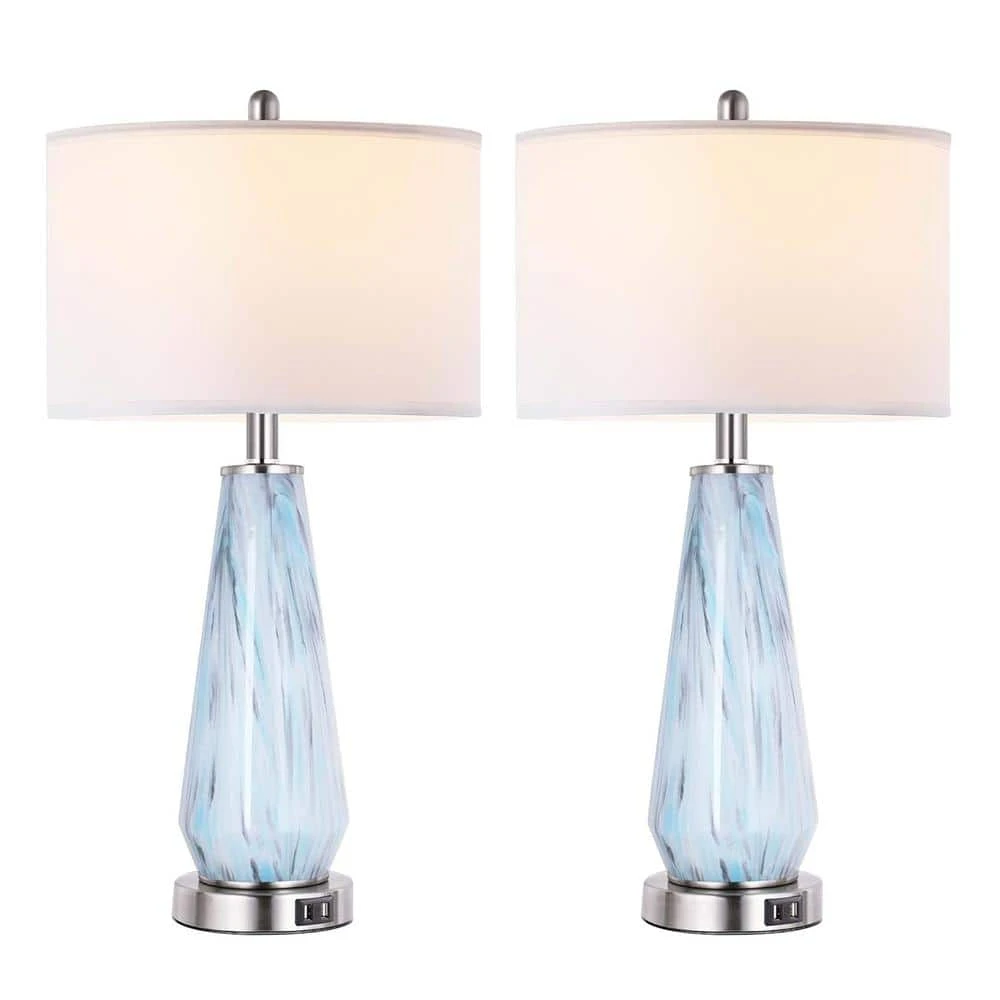 Handcrafted from art glass, this contemporary table lamp comes in blue and gray color tones and is accented with brushed nickel finish metal and a white fabric shade. Its modern coastal look is a great addition to your room.The bedside lamp offers 3-level brightness options (Low, Medium, High) to meet your different needs. Just tap anywhere on the metal base to adjust the brightness. Nightlight for good sleep or nursing. Accent lighting for a warm mood. Proper high comfortable brightness for studying or working.This bedroom lamp features a fabric drum shade in a decor-friendly hue of white, adding a splash of color to your decorating pallet.