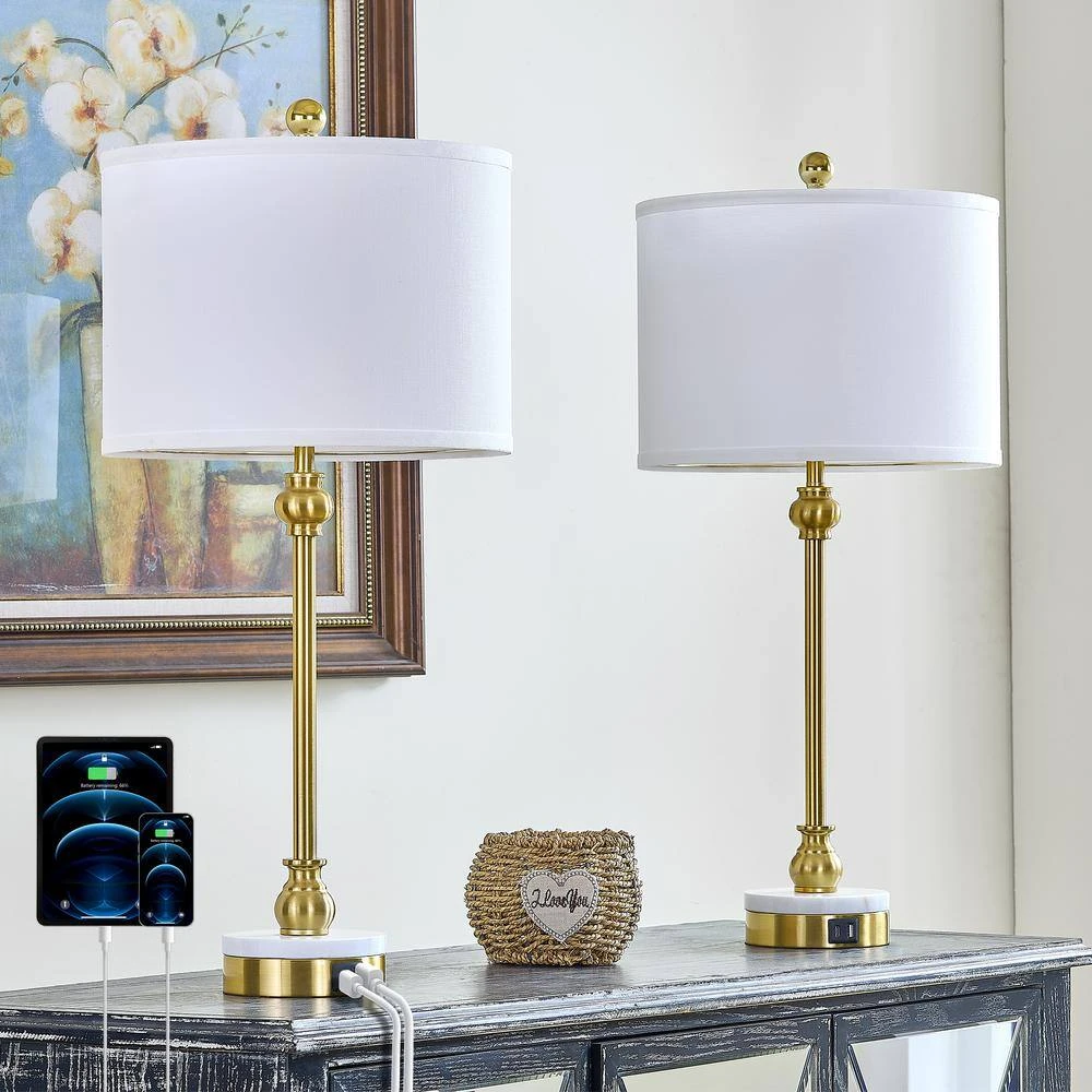 This is a gold modern-style table lamp set, featuring an elegant white fabric lampshade and a marble base, perfectly combining luxury and simplicity. The lamp body is made of high-quality metal, offering a sturdy structure with a sophisticated design, suitable for various spaces such as bedrooms, living rooms, or studies. The classic color scheme complements different home decor styles, adding a touch of refinement and a warm glow to your space. This table lamp is not only a practical lighting tool but also a piece of art that enhances your home’s aesthetic appeal.