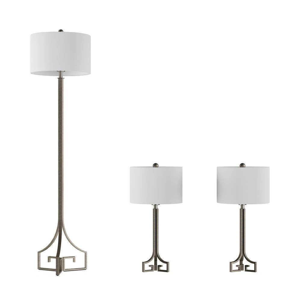 Instantly transform your space with stylish form and function, with this elegant and unique Greek Key Design Floor and Table Lamp Set from Lavish Home. With a beautiful yet sturdy tripod base that features an eye-catching antique silver finish metalwork design inspired by a popular symbol of friendship, love and unity, and crisp ivory shades. The lamps provide beautiful warm ambient lighting for your entryway, bedroom, living room, or home office. The UL-listed set of two table lamps and one floor lamp conveniently come with energy-saving replaceable ETL listed LED lightbulbs that have a 25,000-hour lifespan. It’s a perfect matching 3-piece set that will add a unique and modern touch in any room!