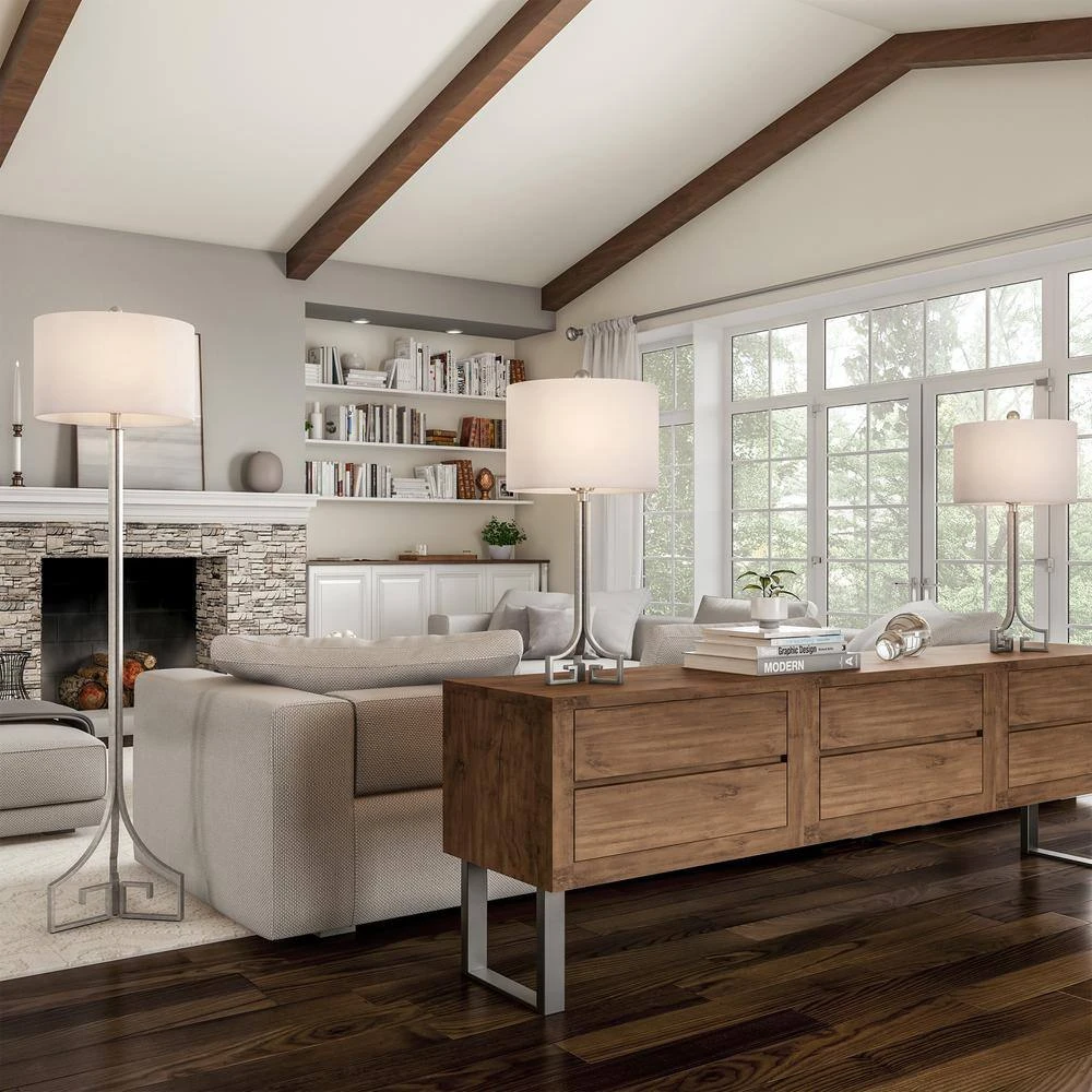- With two table lamps and one floor lamp included, you can place the lamps separately in different rooms or utilize the matching set in one room for a more consistent look. The crisp ivory drum shades will complement any decor.