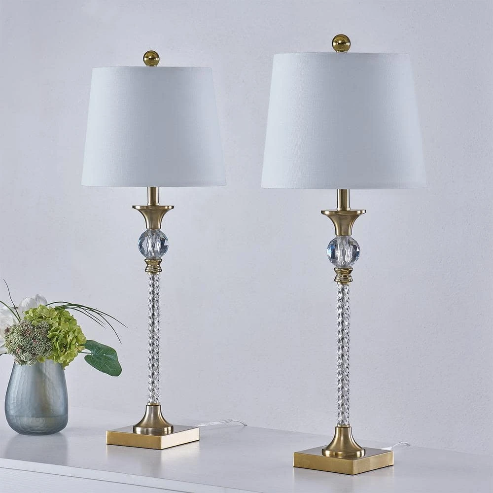 This 2-piece buffet lamp set adds glam style and plenty of illumination on your end tables or nightstands. They feature a thin, wrought iron body accented with crystal-inspired designs that reflect the light and they rest on square brass bases. Each lamp is topped with a fabric empire drum shade that diffuses ambient light from a 100W bulb (not included) throughout your living room or bedroom. We love that their sizable 29.5 in. tall designs make a statement in any room. Plus, these table lamps are operated by a convenient rotary switch.