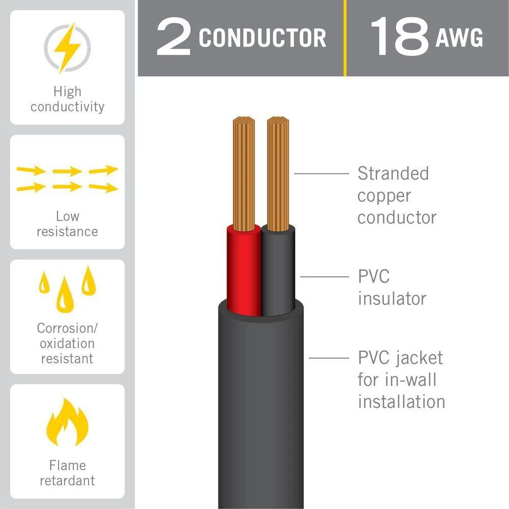 18 AWG 2C In Wall Cable is optimized for use in a wide range of applications, including LED lighting installations such as white or single color LED strip light installations, LED tape light installations, CB radios, stereo/sound equipment and other low-voltage appliances. Made using premium quality copper and UL rated, flame resistant PVC. Temperature resistant, rated up to 80 degrees Celsius (176° F).