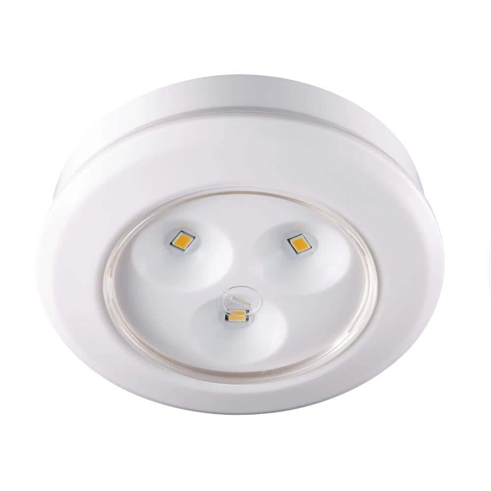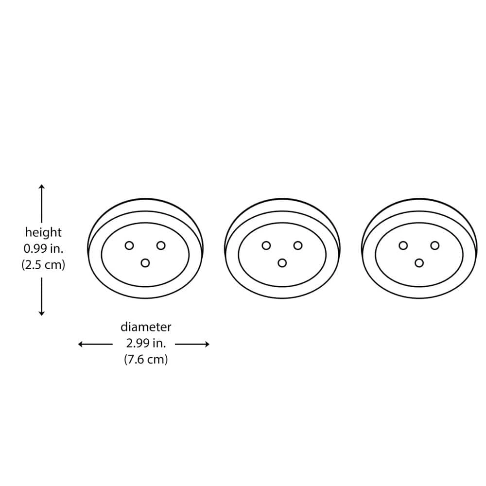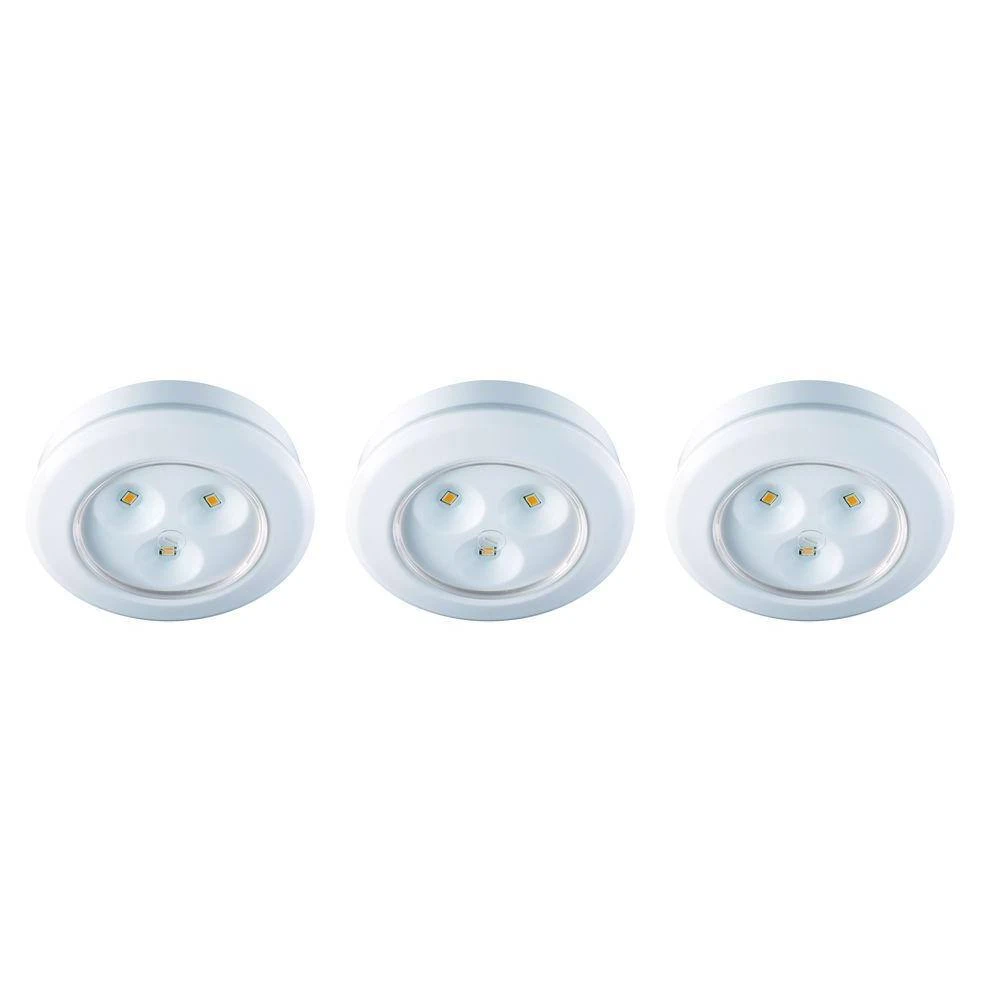 These powerful LED puck lights are easy to install and convenient to use. Simply press the light to turn on, and press again to turn off. Apply to nearly any surface using the double-sided adhesive tape included, or mount more permanently using the mounting screws provided. Each puck Light is powered by batteries and provides 60 lumens of light output. The LEDs shine bright and are made to last for years. These puck lights are ideal for use as kitchen under cabinet lighting, in closets, along hallways, or any place bright light is needed without the hassle of wiring. Sold in packages of 3 battery operated puck lights.